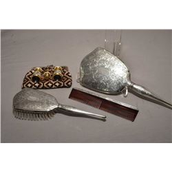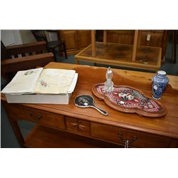 Selection of vintage collectible including Victorian mahogany and beadwork footed dresser tray, a sterling mirror, blue and white vase, pressed glass