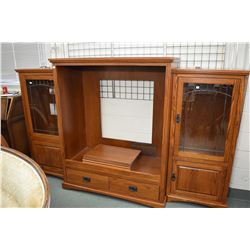 Semi contemporary Mission style three piece entertainment unit with leaded glass doors