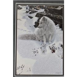Framed limited edition print titled "Blue Shadows-Arctic Fox" pencil signed by artist Ron Parker, 40