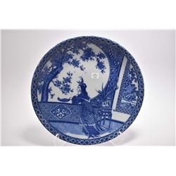 Antique Oriental blue and white charger with woman overlooking her garden scene, 14 1/2" in diameter