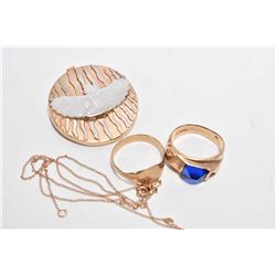 Selection of gold jewellery including 14kt yellow gold and carved opal Egyptian figural pendant, a 10kt gold chain, 10kt gold ring and a well worn gol