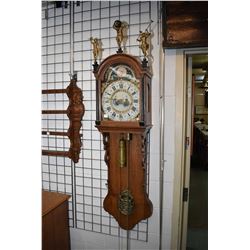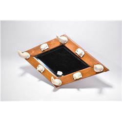 Antique oak framed bevelled wall mirror with walrus tooth hat hooks and decoration