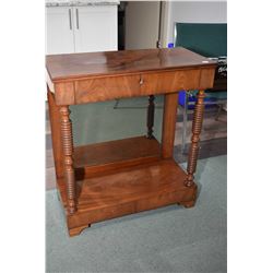 Antique hall stand with turned supports, mirrored bottom and single drawer