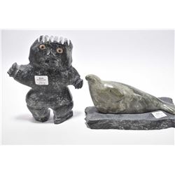 Two signed soapstones including 7 1/2" figure signed K Pugiqnak, #0043 and green carved soapstone seal on black stone base signed Simeonie Kavi...