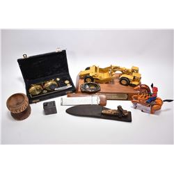 Selection of collectibles including sliding snake box, interesting German made sheathed knife with fold out accessories in handle, leather cased slide