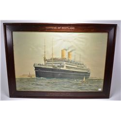 Framed promotional print of the Empress of Scotland with incised wooden framed label at top Empress