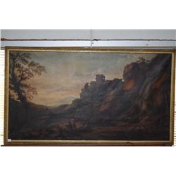 Antique oil on canvas painting of a hillside castle and figures fishing, no signature seen, 29" X 53"