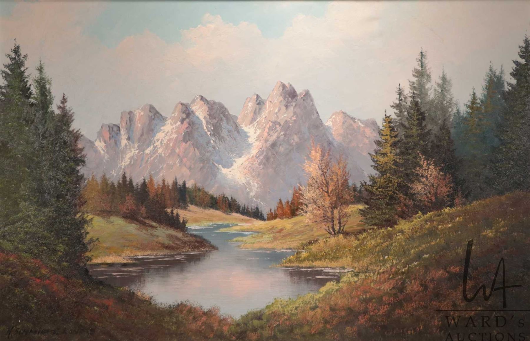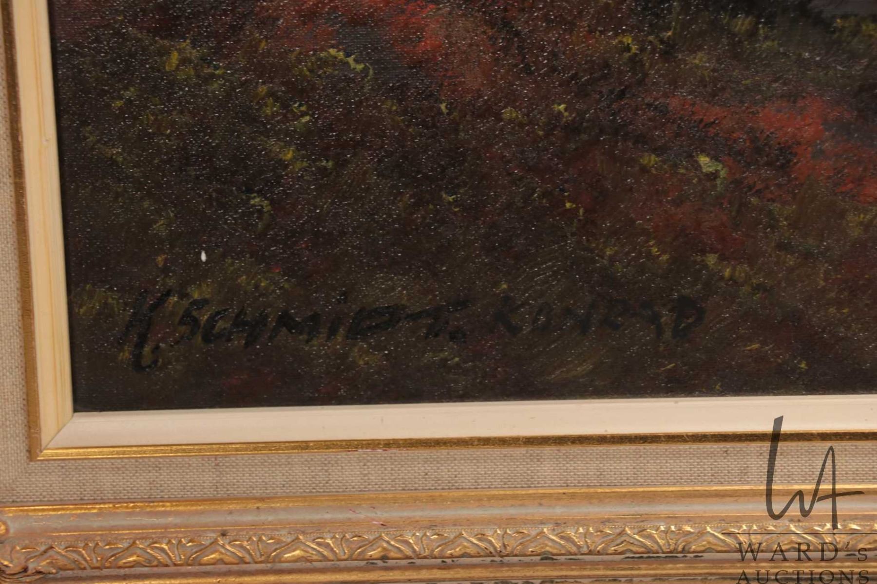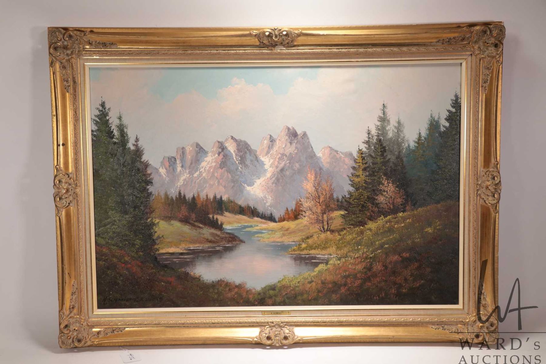 K. Schmidt. Konrad, gilt framed oil on canvas painting of a mountain creek scene 23" x 35"