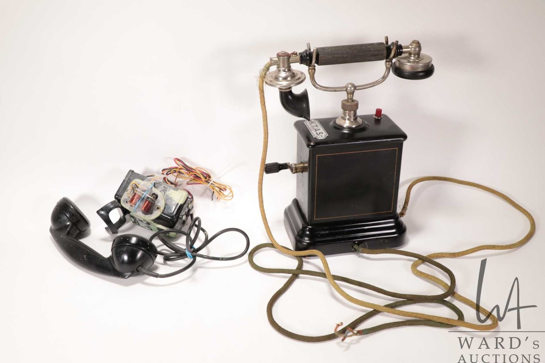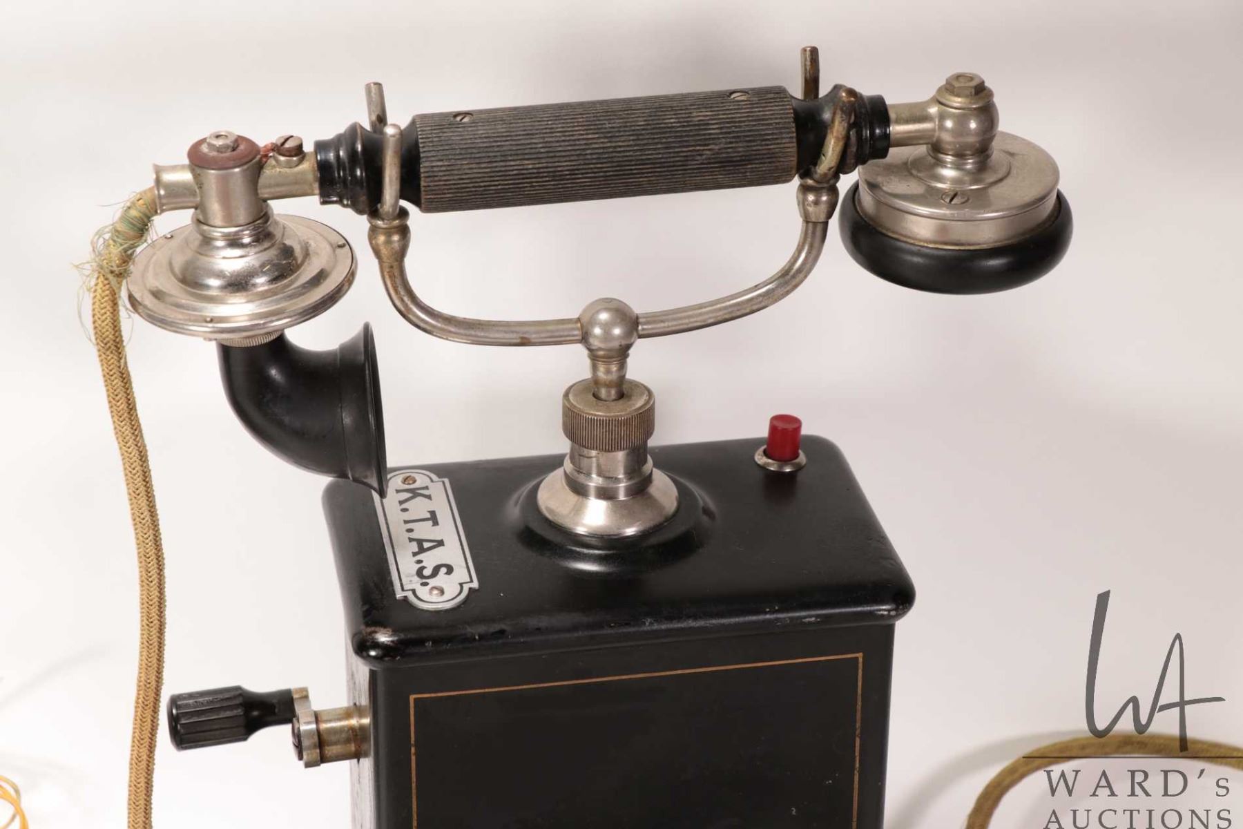K.T.A.S.Ericsson Model AC 400 antique hand crank magneto desk telephone plus a Western Electric wall mount hand set with bakelite receiver