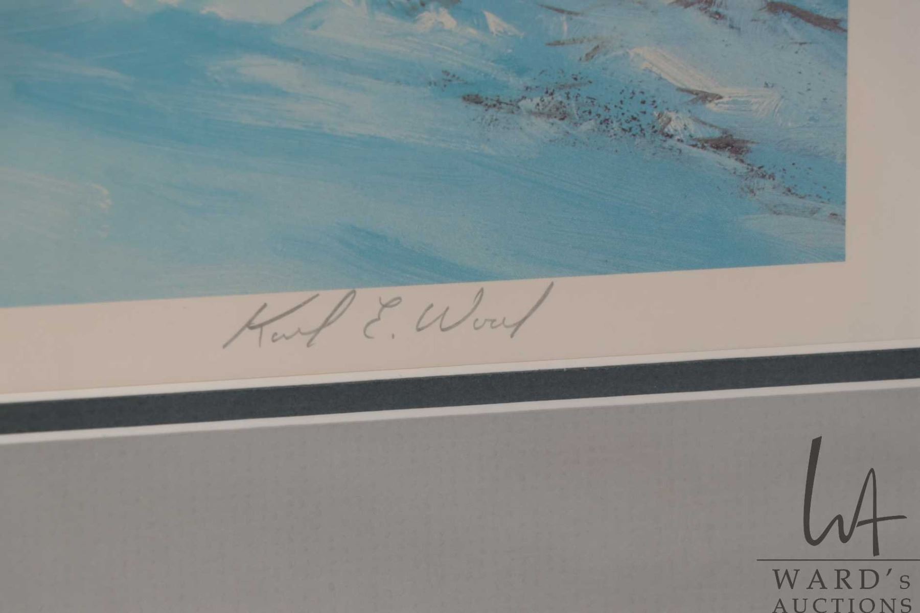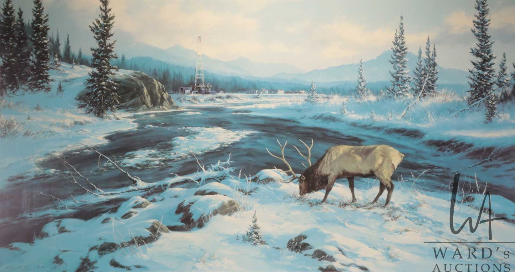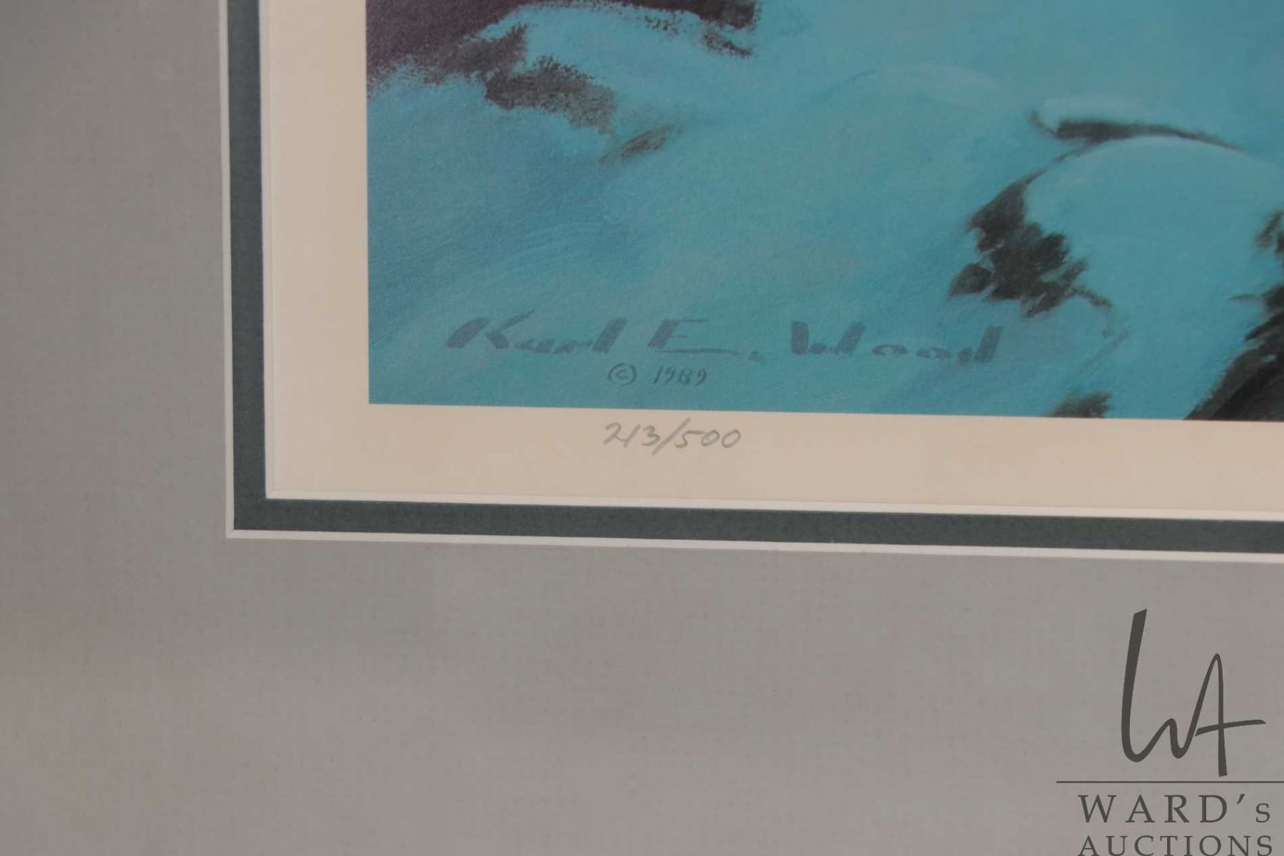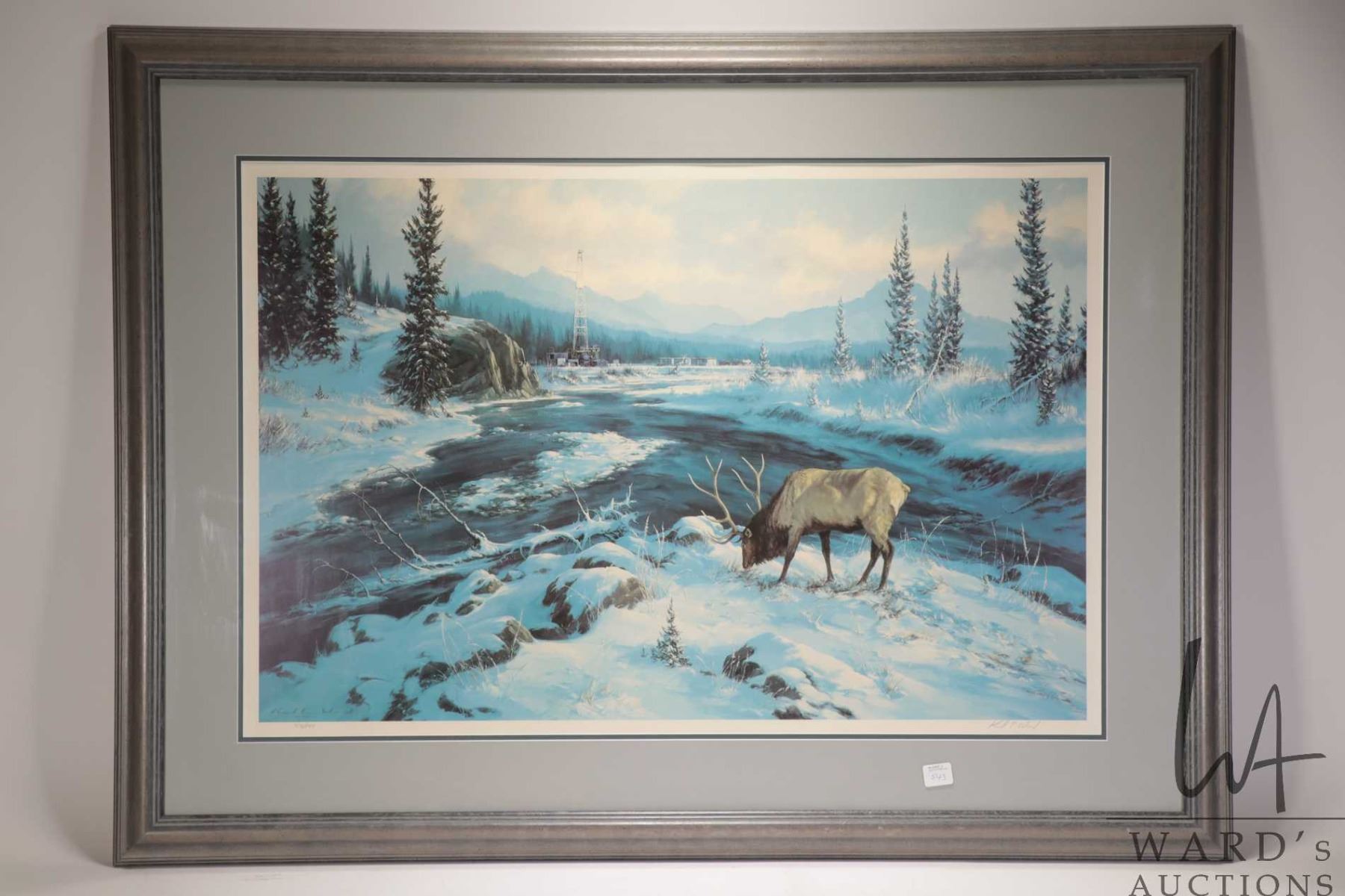 Karl E. Wood, framed limited edition print of an elk graving in winter, pencil signed by artist 213/