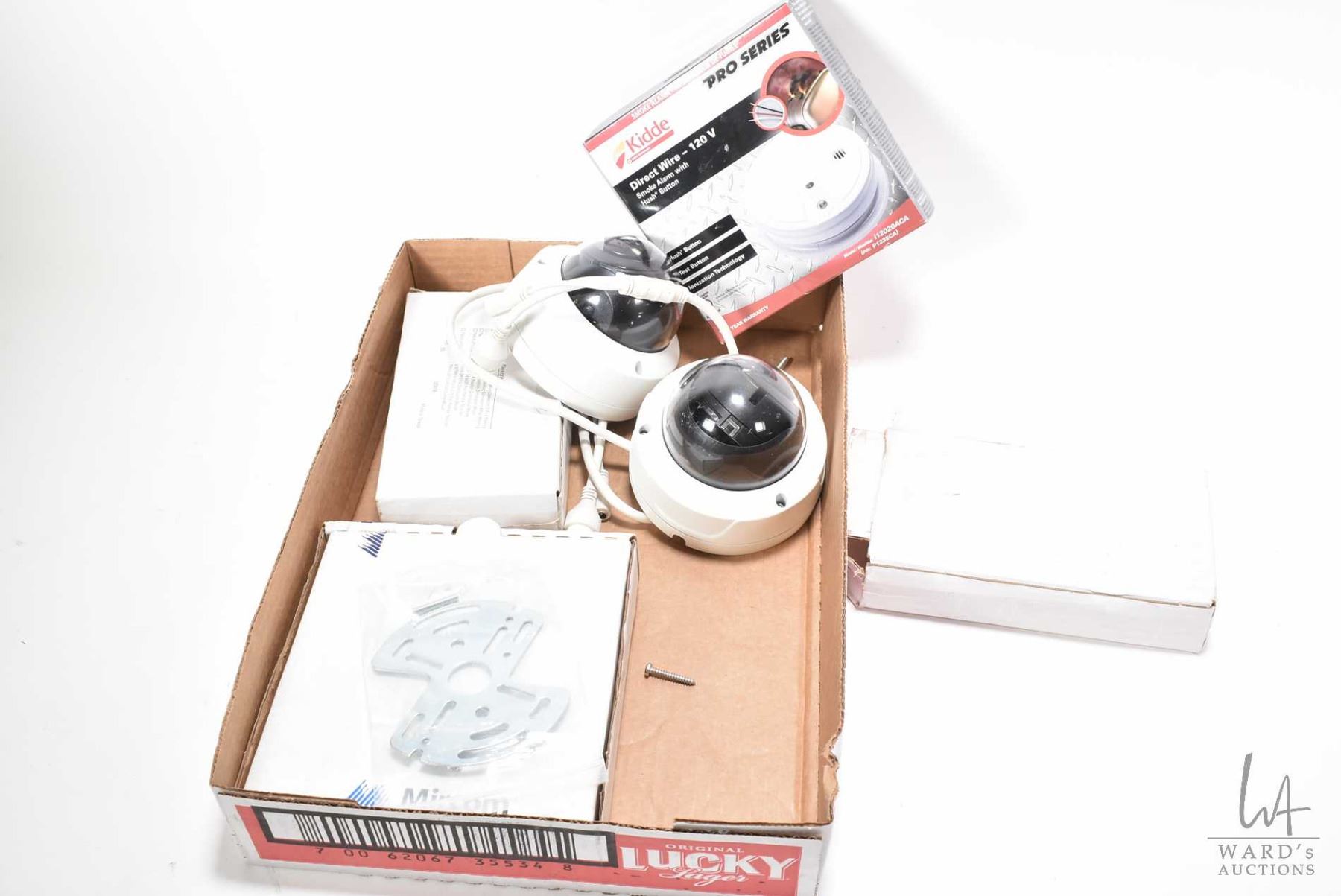 Kiddie Pro Series electric smoke alarm, a box with seven TSOC TMBX-1A4 connector, a Mircom TH-102 heater, and two outdoor video cameras