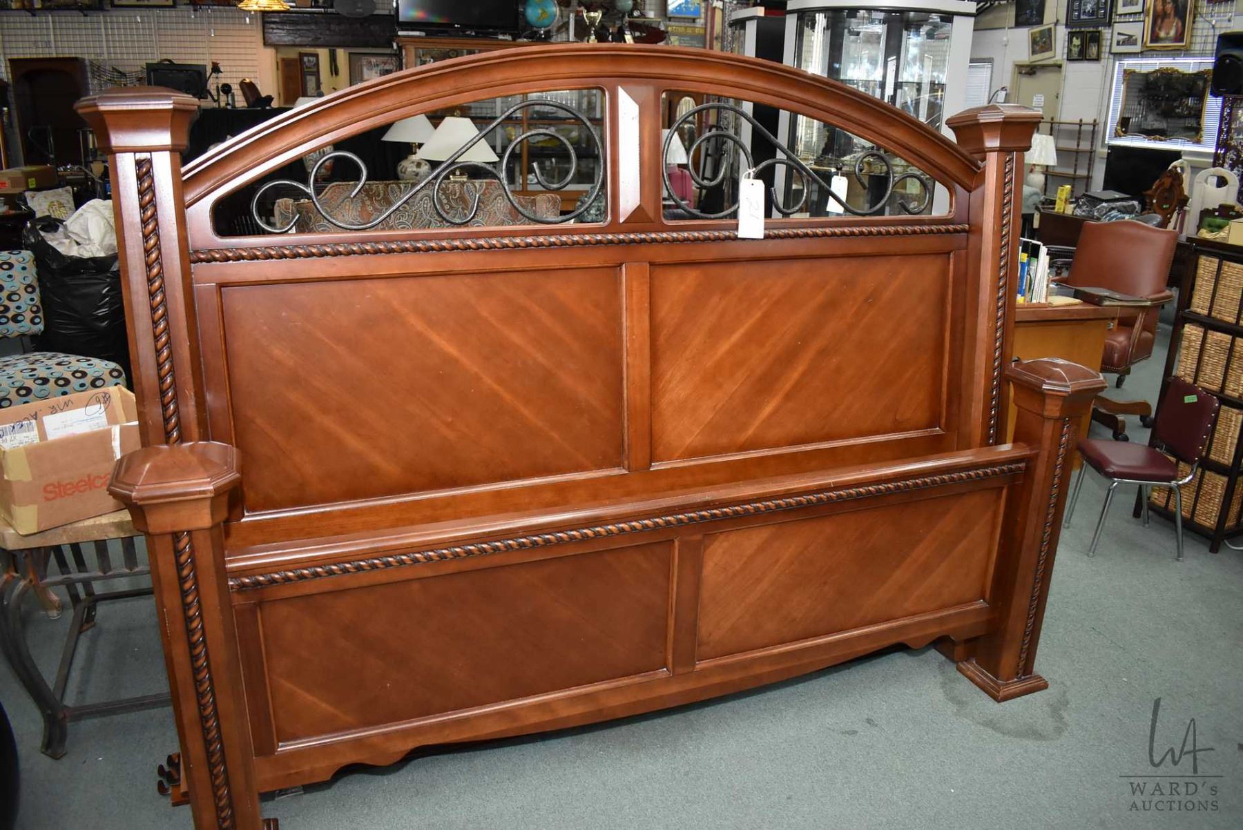 King sized headboard, footboard and rails with wrought iron and carved rope style accents