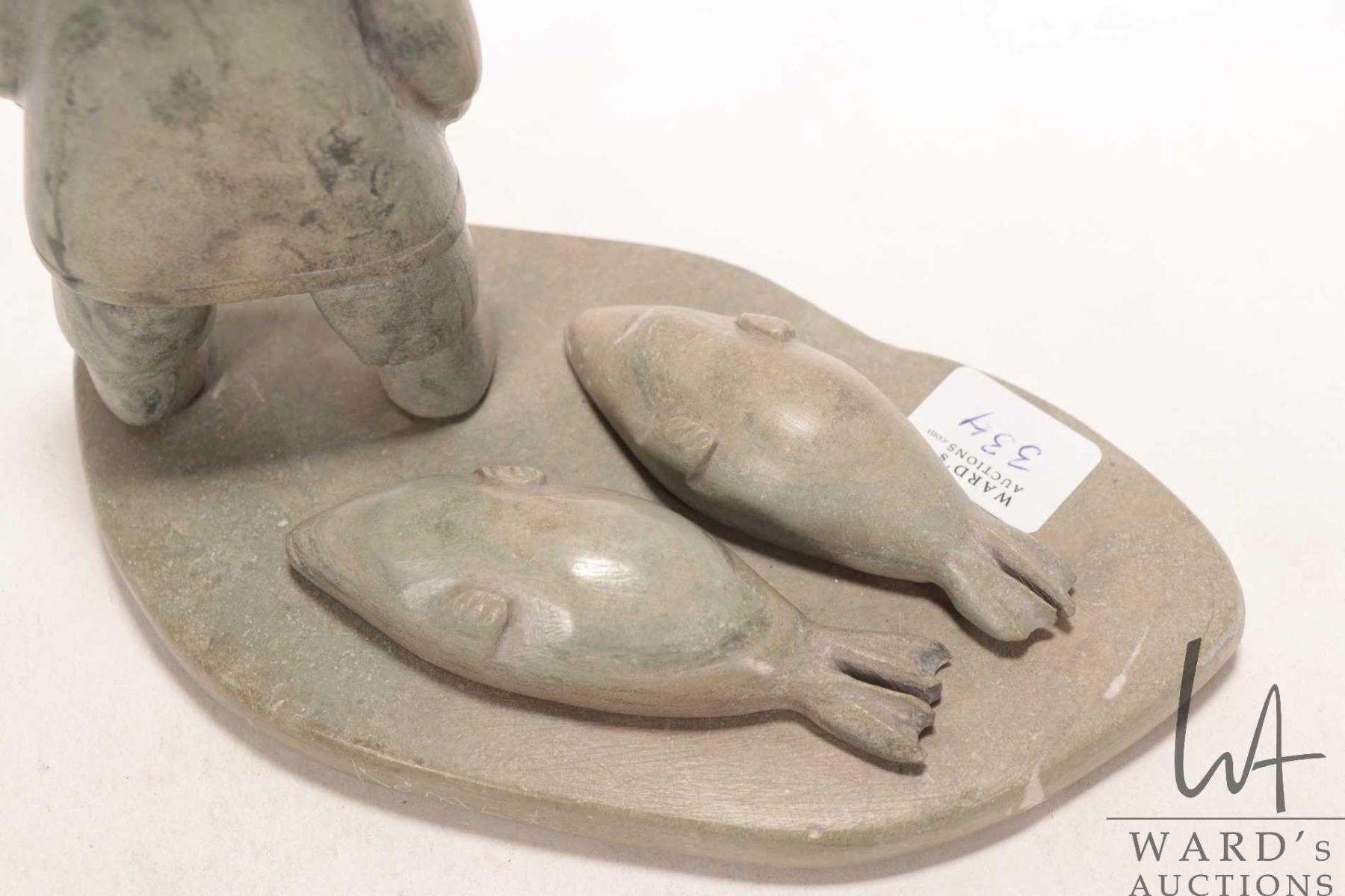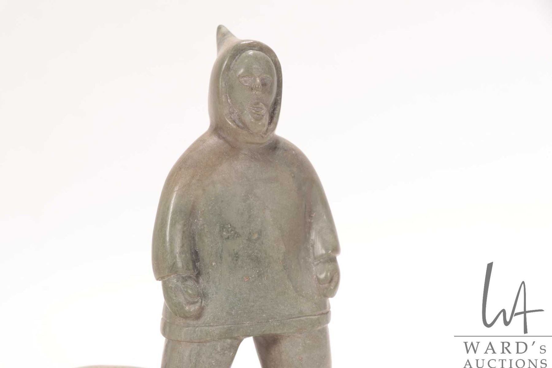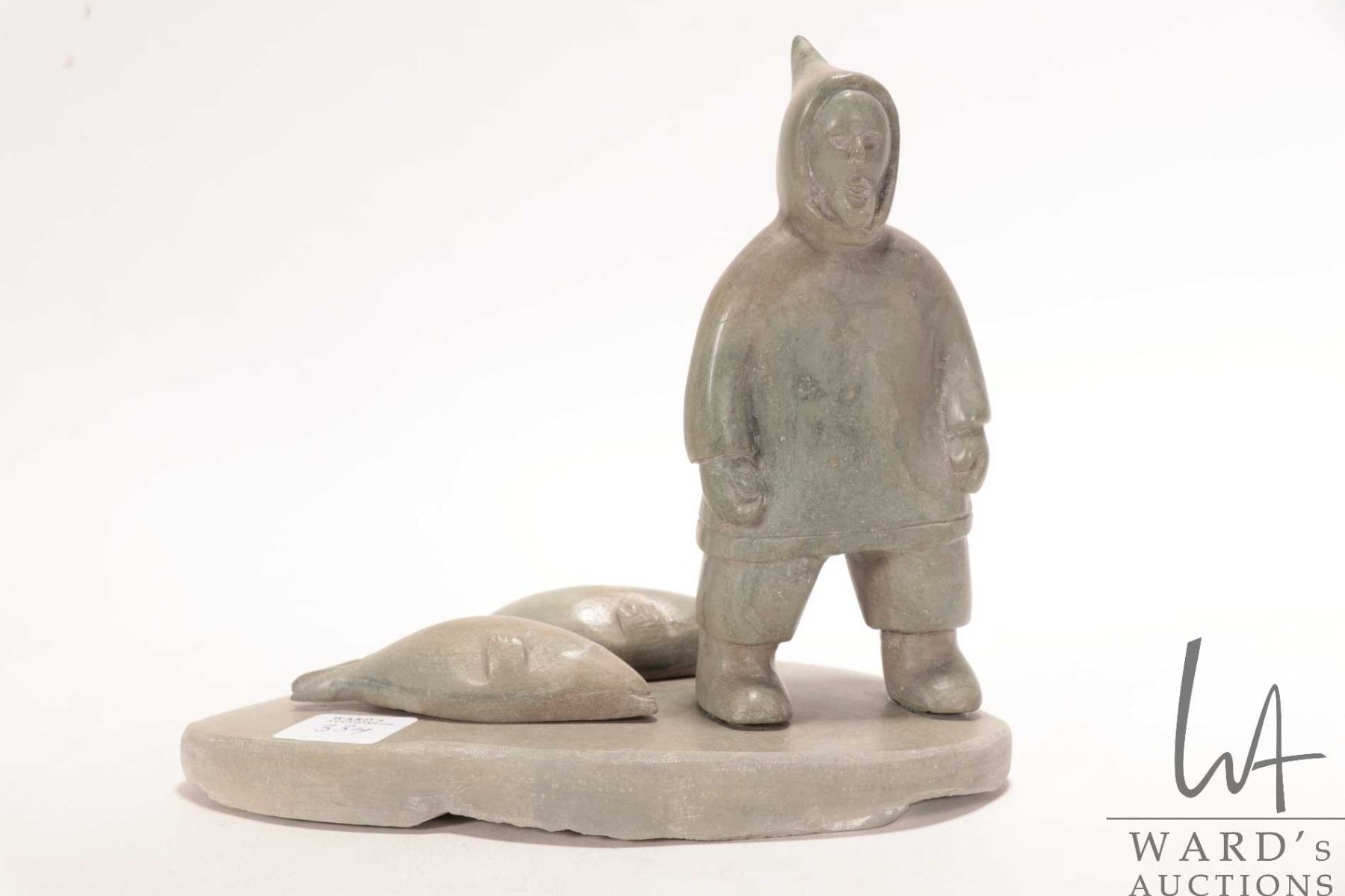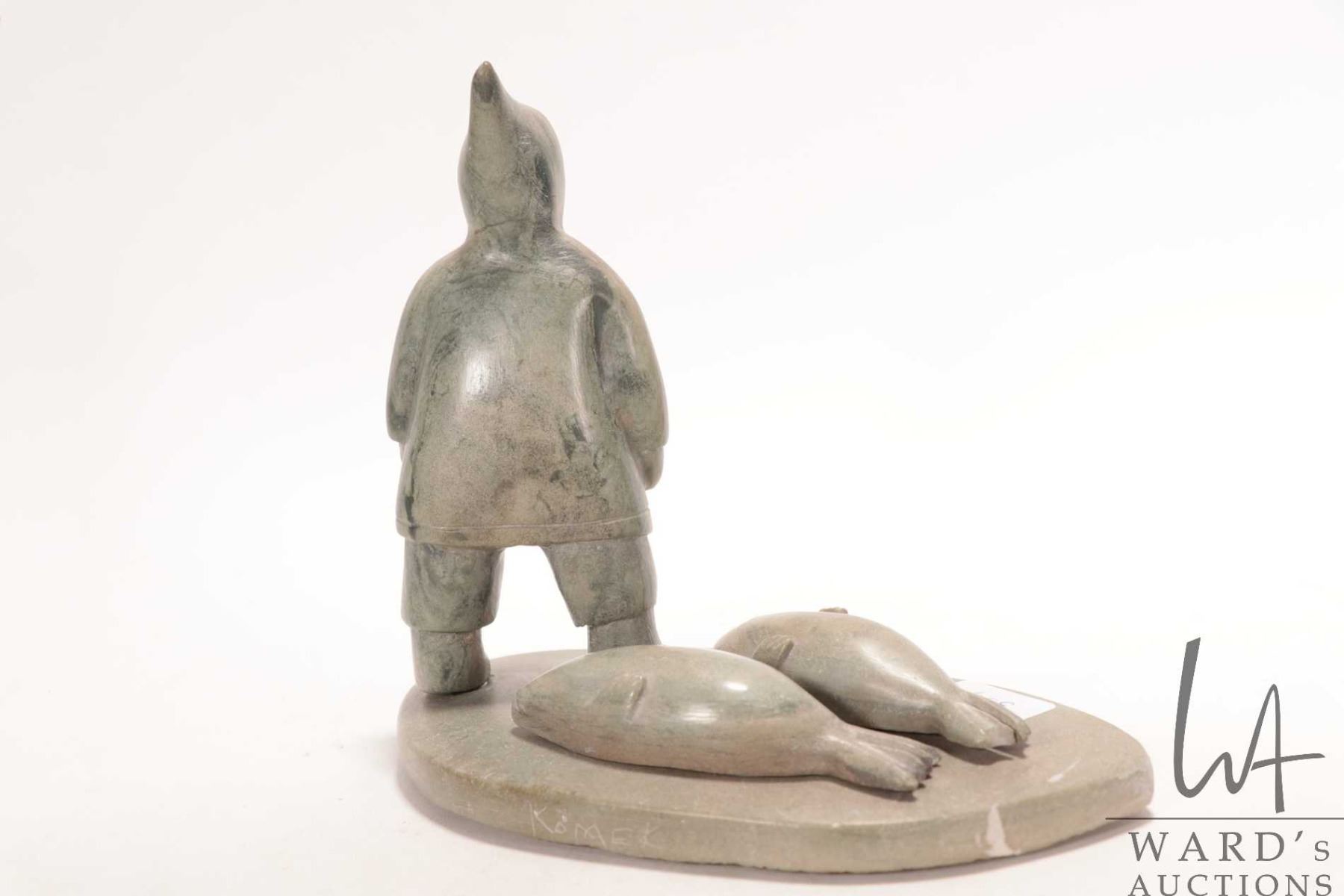 Komek ( Annie Komek Kigiuna?) signed hand carved soapstone hunter with two seals, 6 1/2" in height