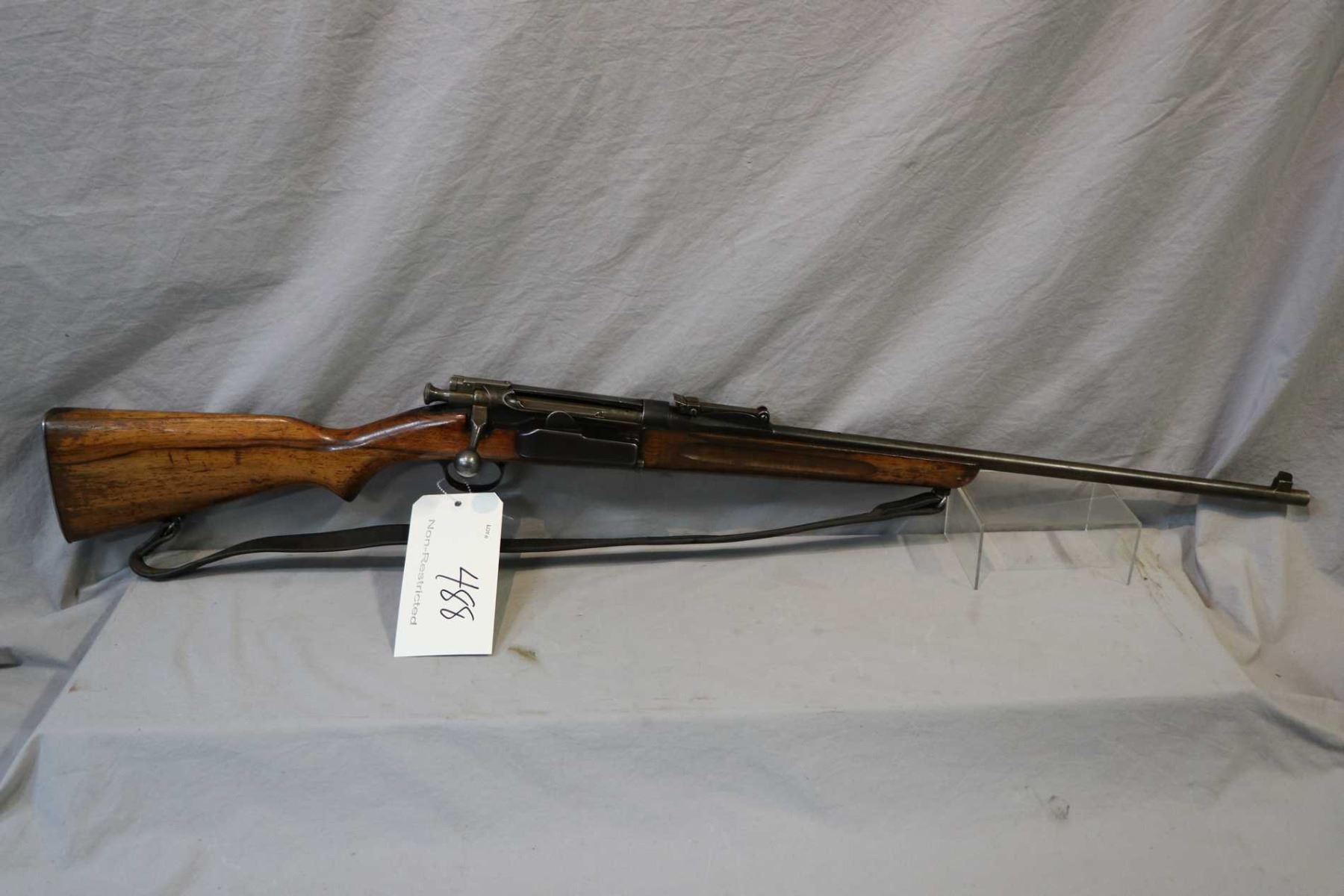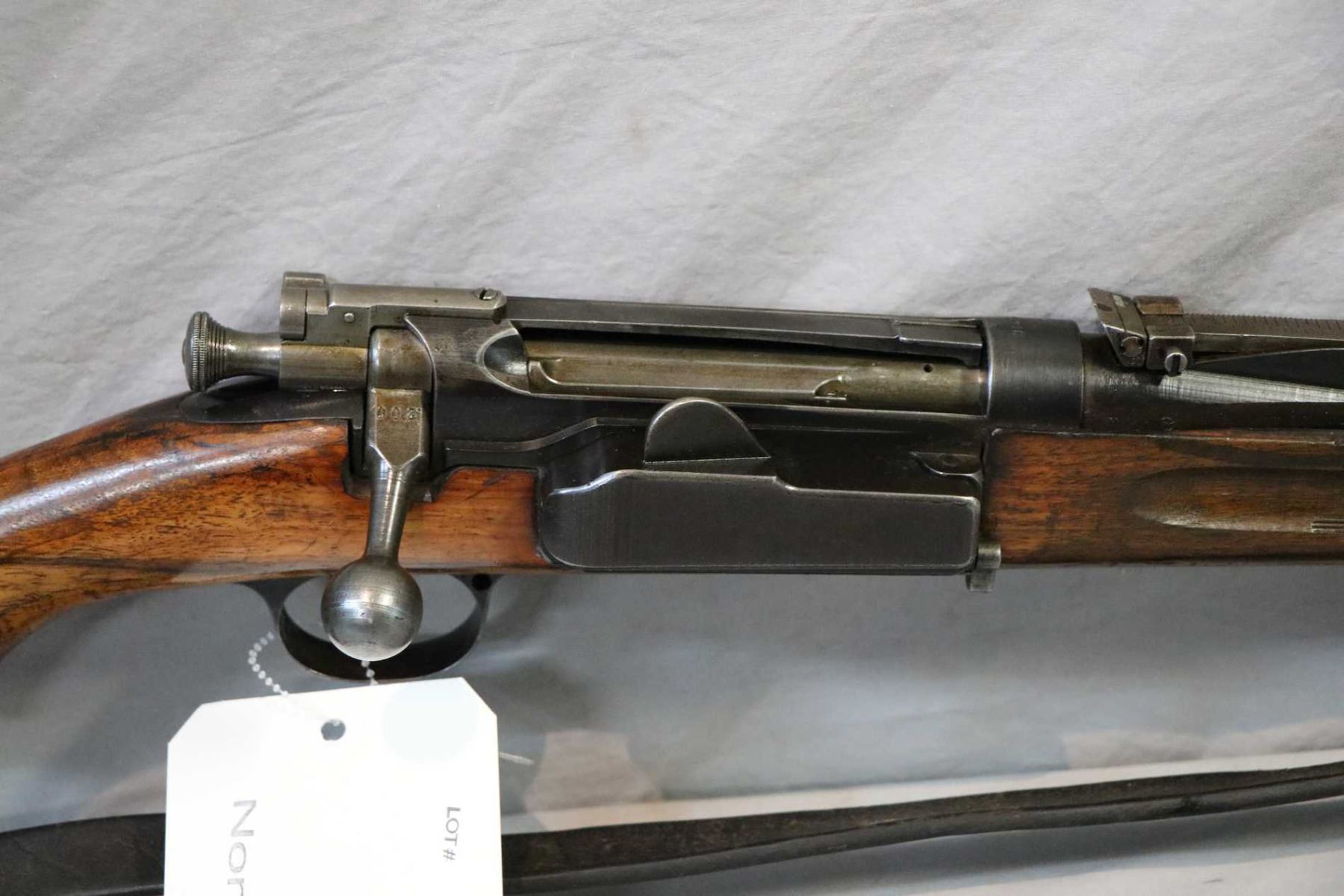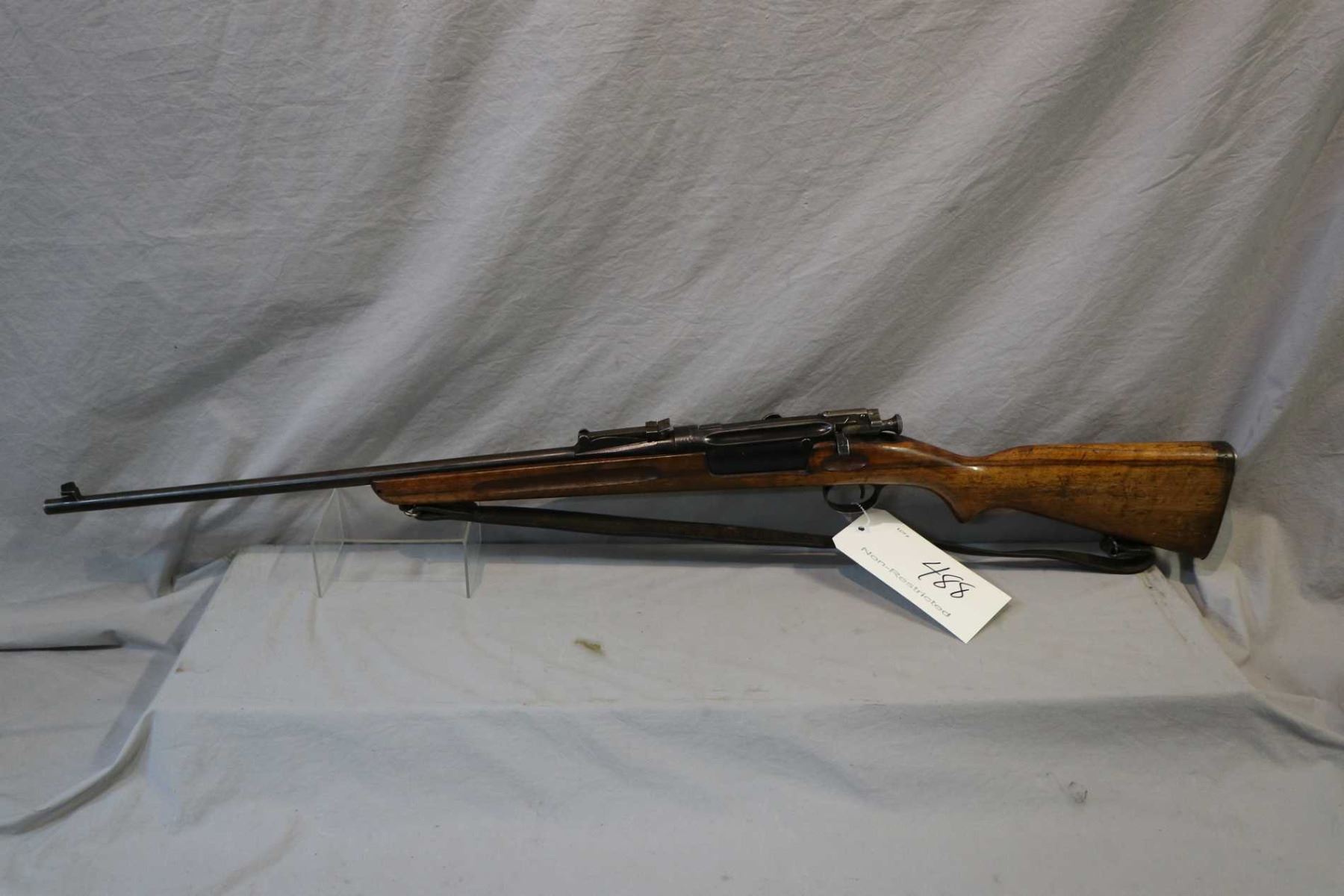 Krag - Jorgensen Model Sporter 6.5 x 55 Cal ? Bolt Action Sporterized Rifle w/ 24" bbl [ fading blue finish turning brown in some areas, fair sporterized stock, barrel sights, old leather sling, Dated 1916, various marks and scratches to wood and metal ] Ser # 9963