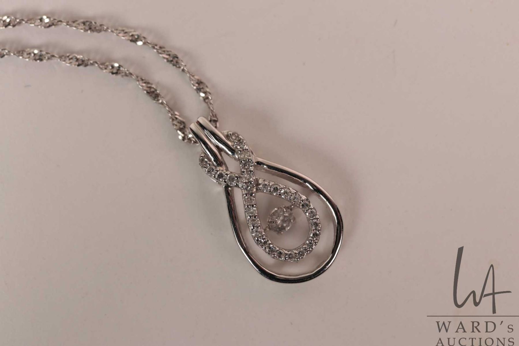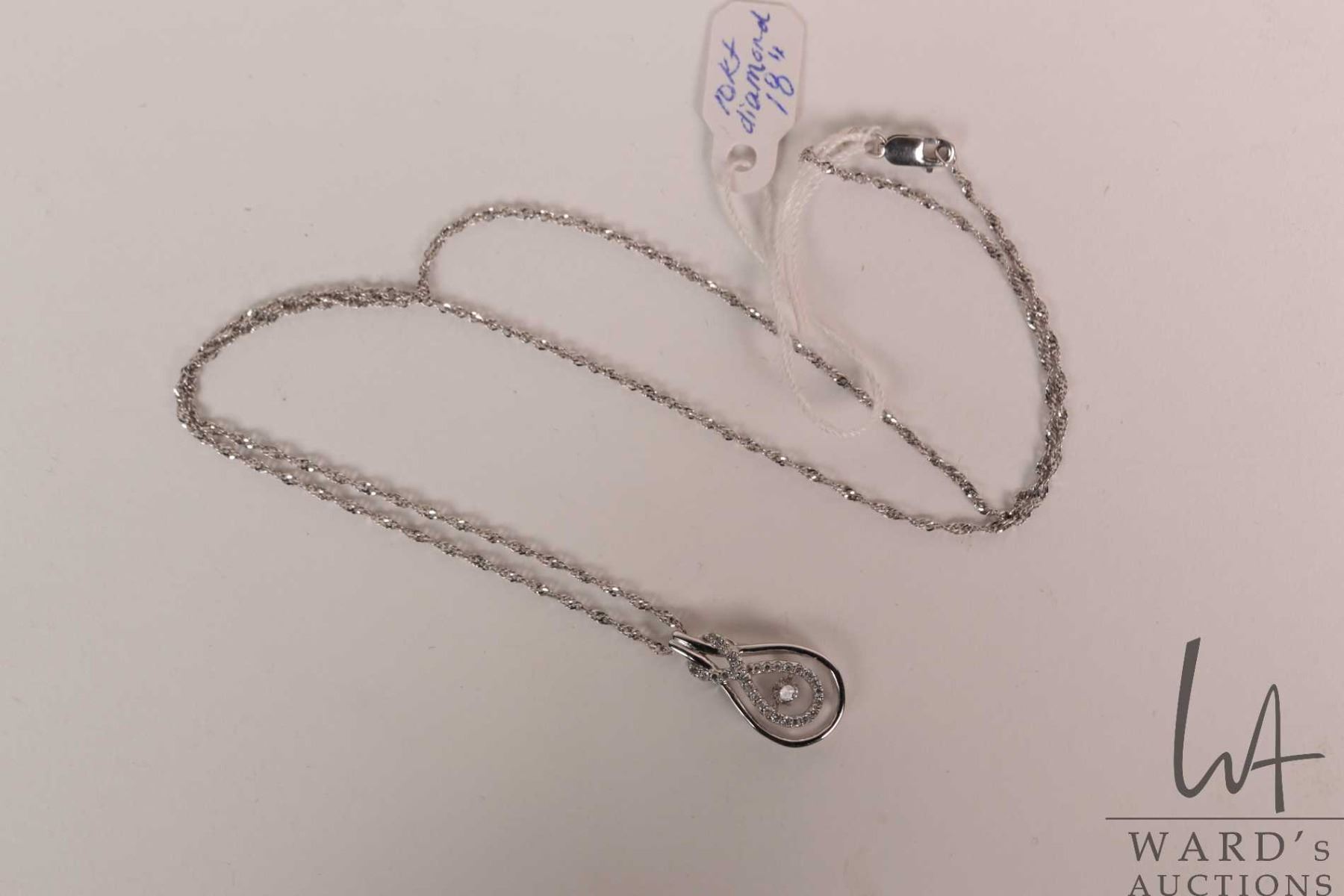 Ladies 10kt white gold and "Infinity" pendant with flickering center diamond gemstone and round white diamond accent gemstones on a 10kt white gold 18" neck chain