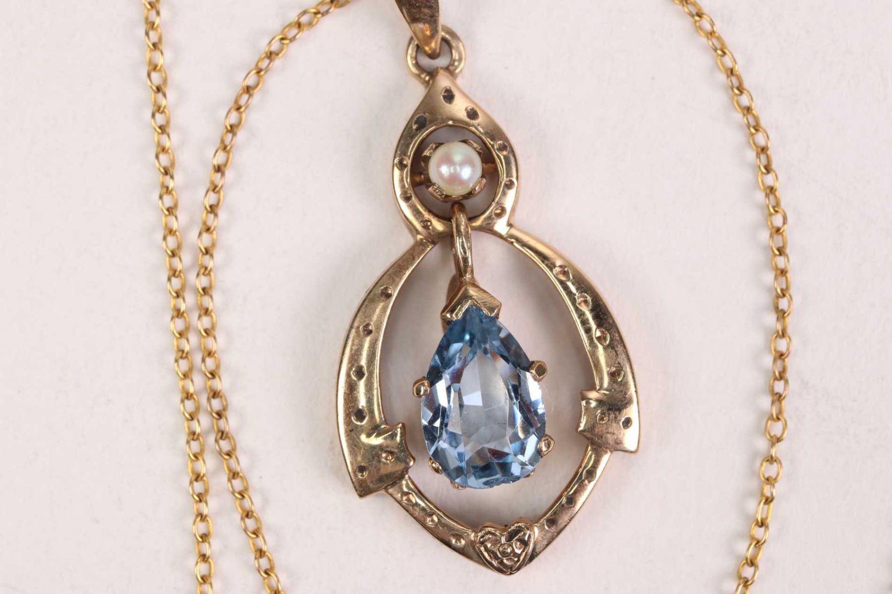 Ladies 10kt yellow gold 16" neck chain and a 10kt yellow gold, genuine pearl and pearl shaped aquamarine pendant and aquamarine pendant