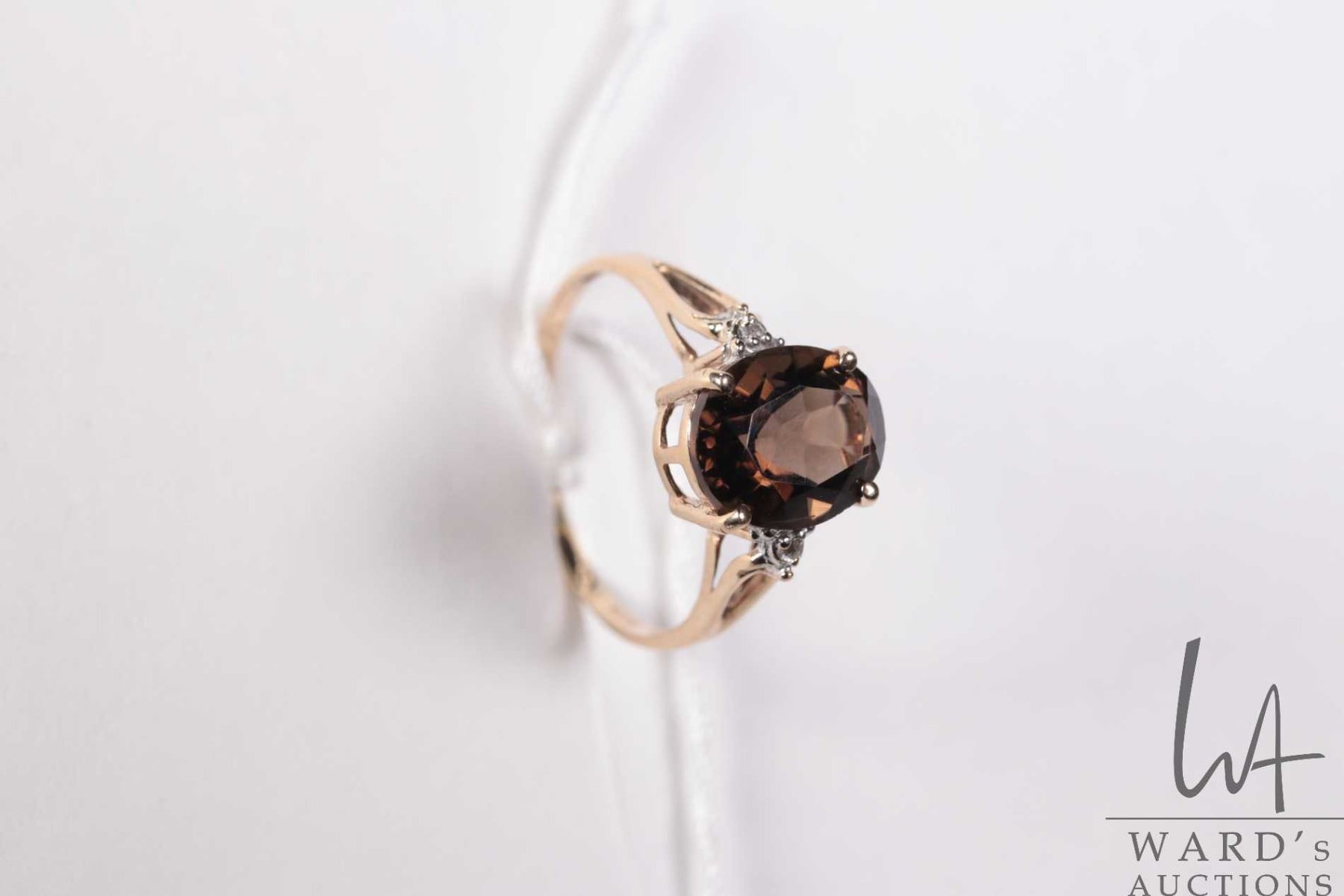 Ladies 10kt yellow gold, smoky quartz ring set with two small accent diamonds, size 6.5