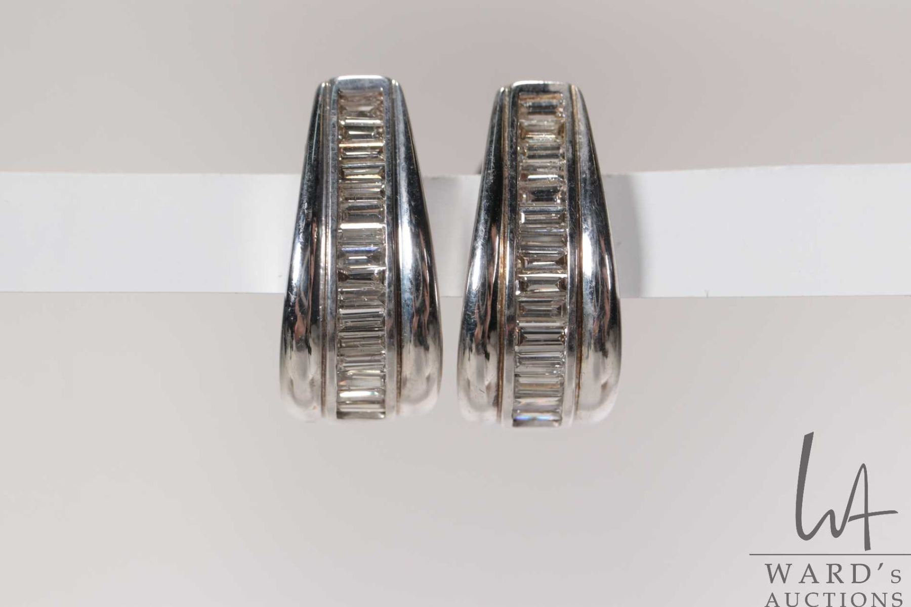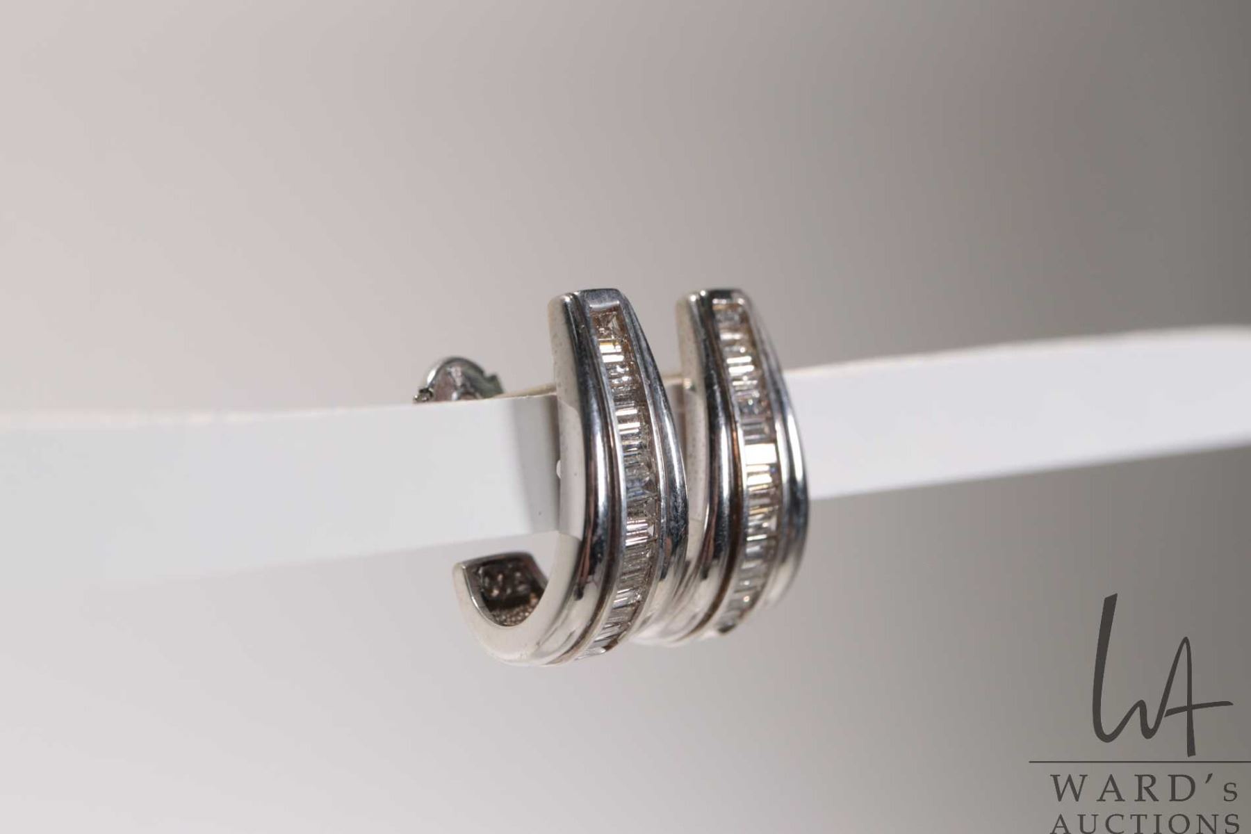 Ladies 14kt white gold and diamond earrings, set with .48cts of straight and tapered baguette cut diamonds.