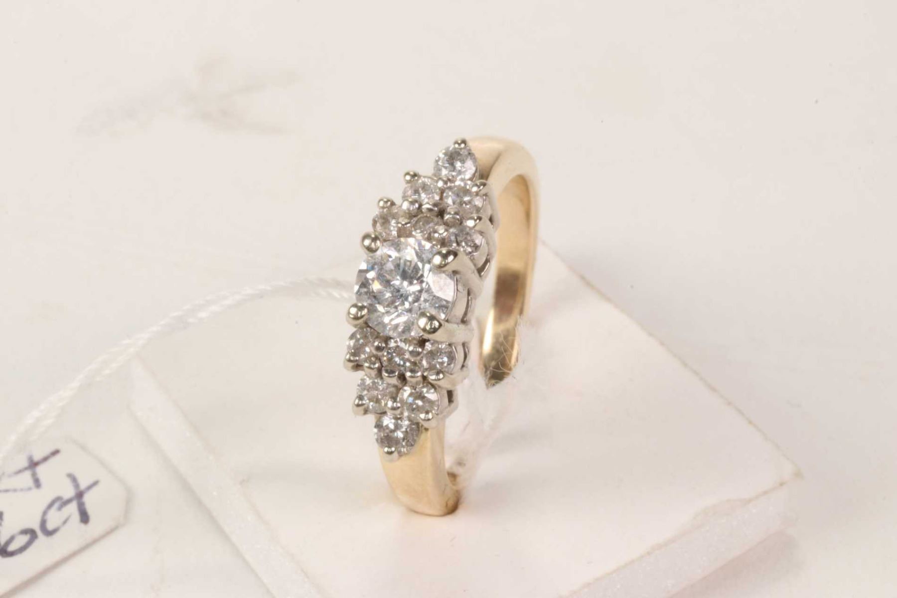 Ladies 14kt yellow and white gold ring set with center .46ct brilliant white diamond and .40ct of side diamonds. Retail replacement value $3200.00