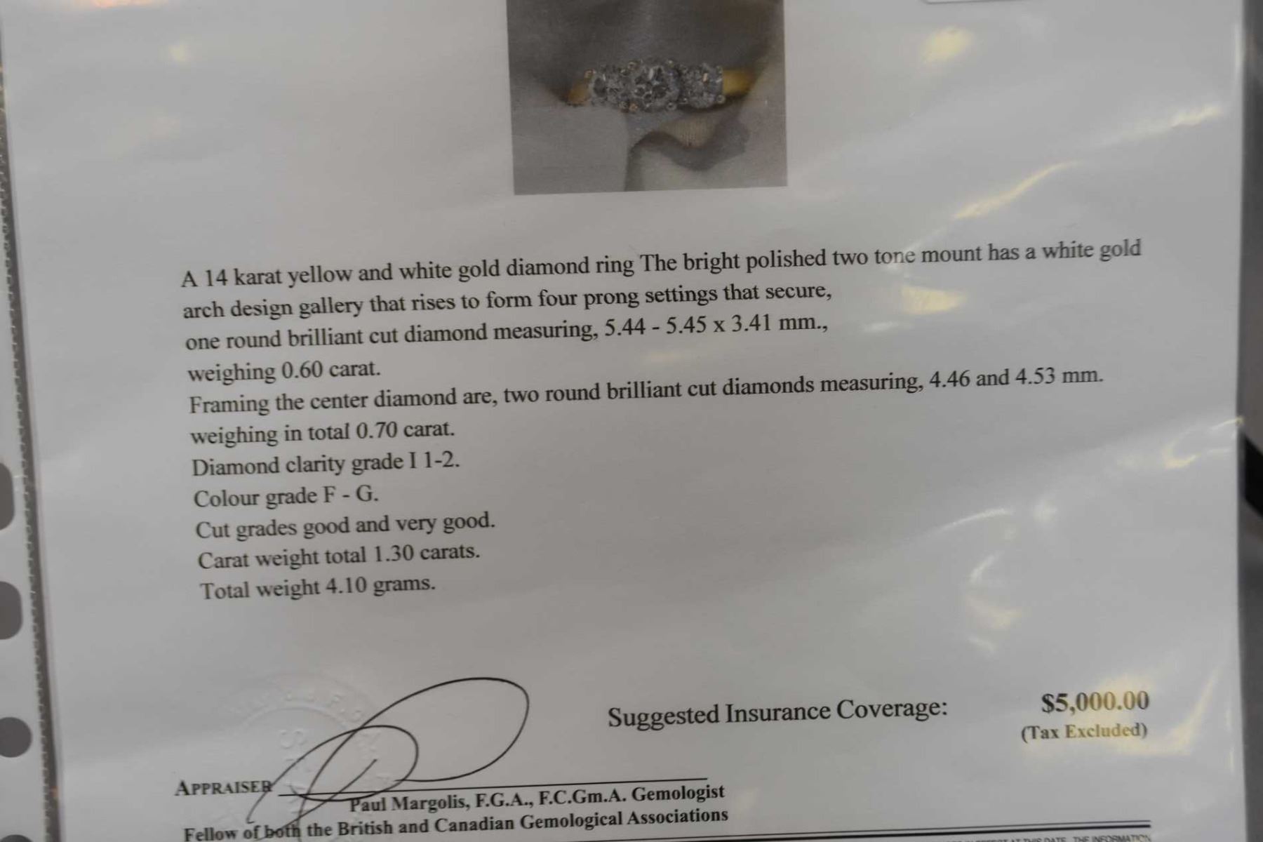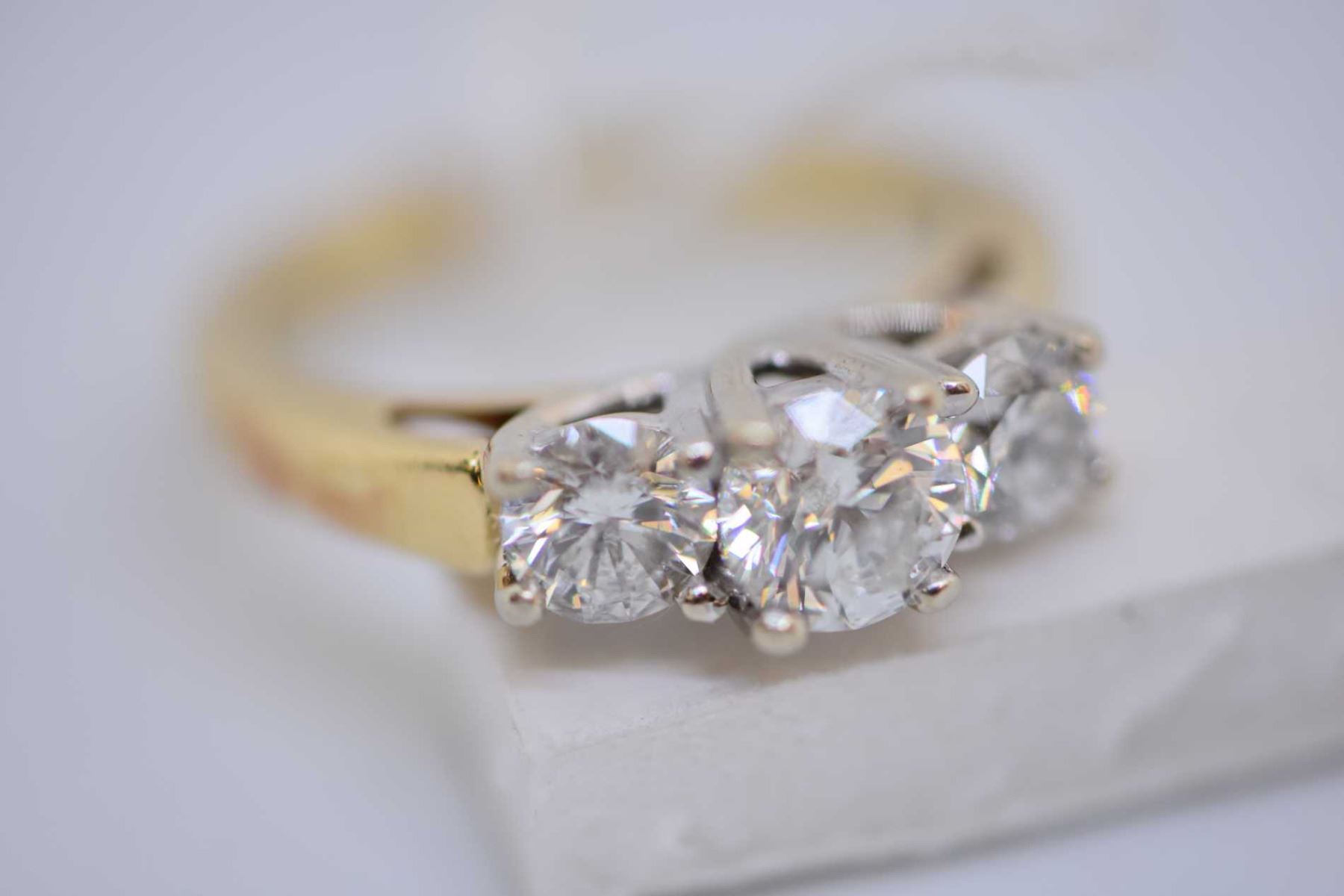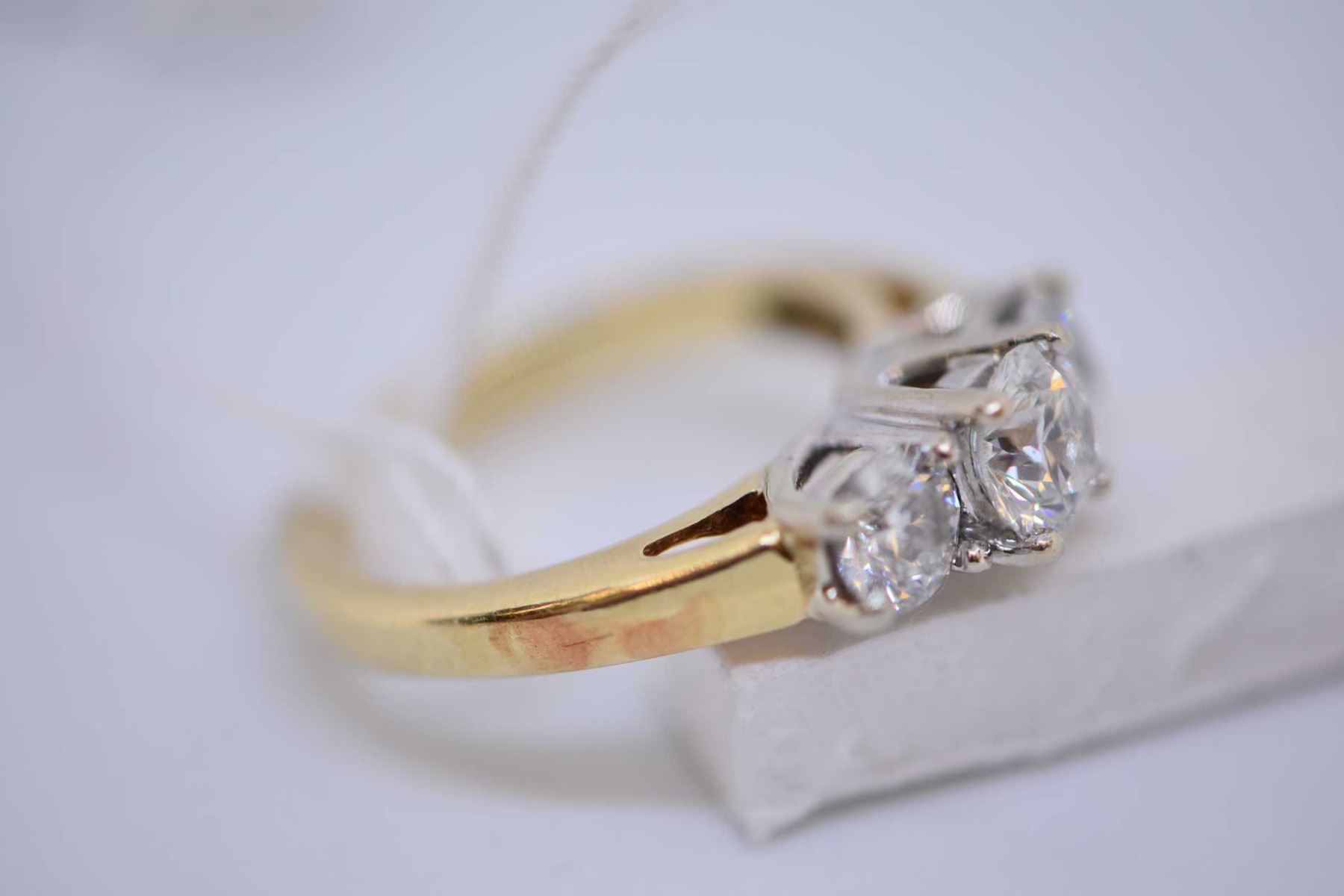 Ladies 14kt yellow and white gold three stone diamond ring set with 1.30ct of brilliant white diamonds. Retail replacement value $5,000.00