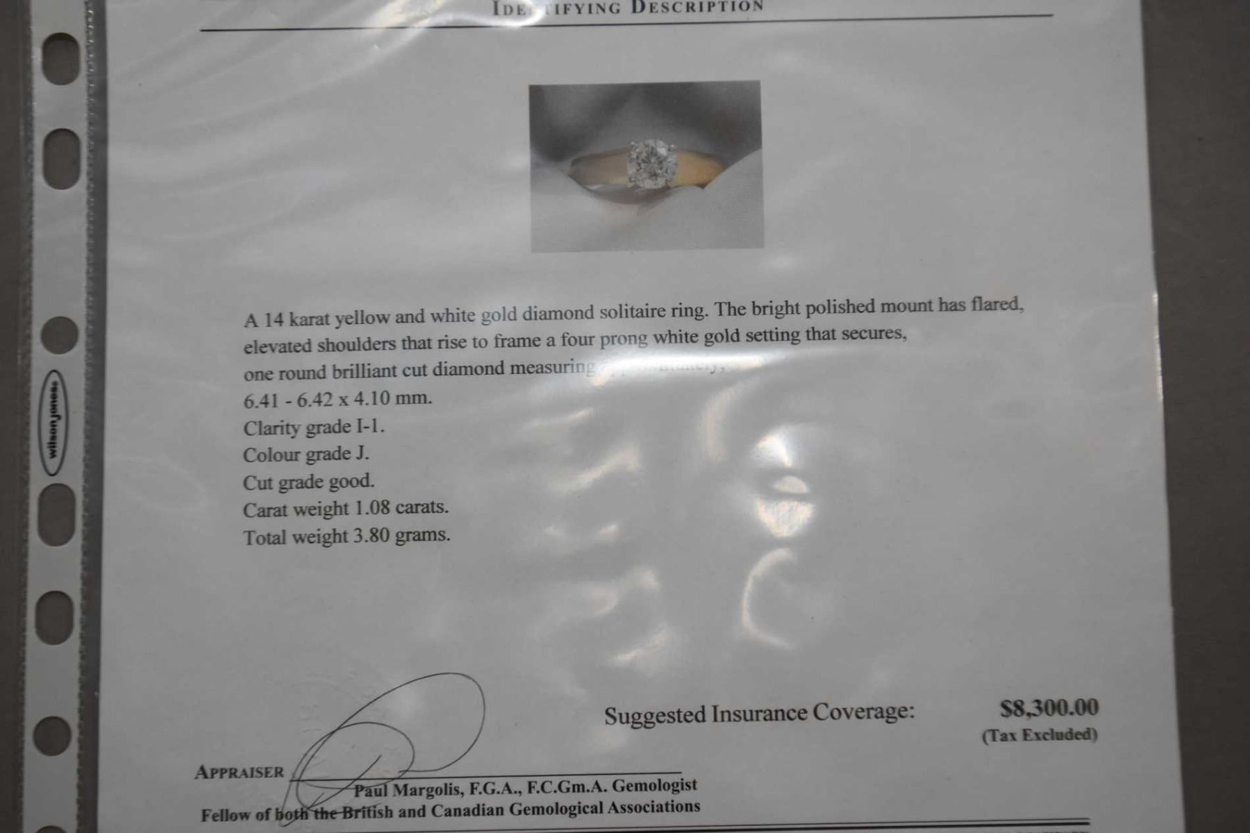 Ladies 14kt yellow gold diamond solitaire ring set with 1.08ct round brilliant cut white diamond. Retail replacement value $8,300.00