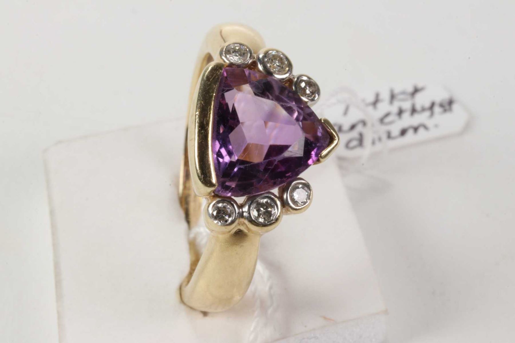 Ladies 14kt yellow gold ring set with trillion cut amethyst gemstone and six bezel set accent diamonds