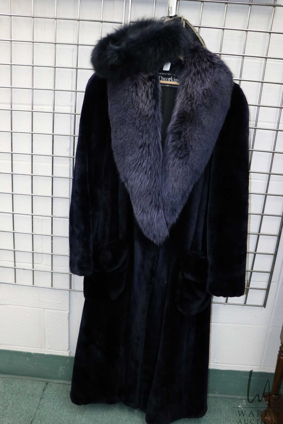 Ladies deep navy almost purple full length fur coat labeled Dworkins- The House that Fur Built, Over 75 Years of Fashion plus a fur head band