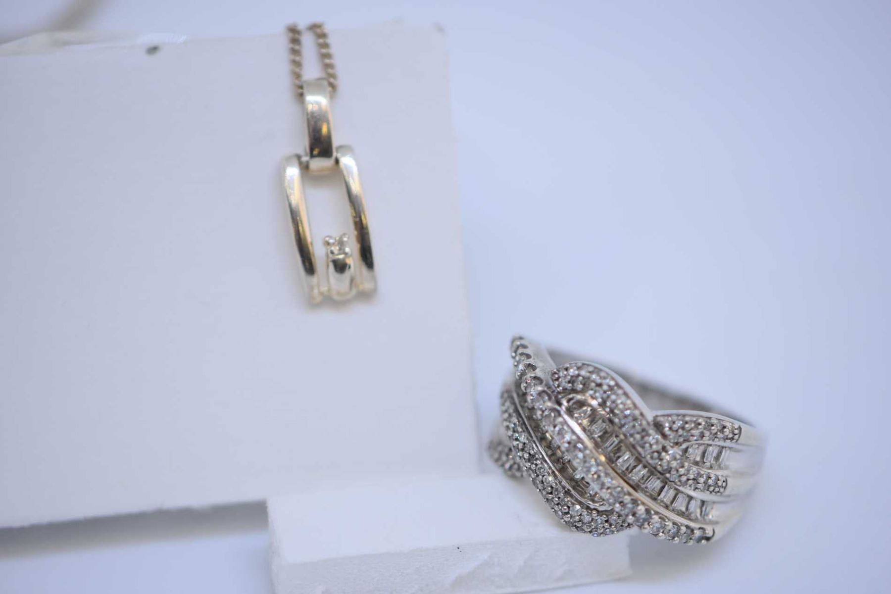 Ladies sterling silver ring set with diamonds and a sterling pendant set with small diamond on a sterling chain