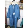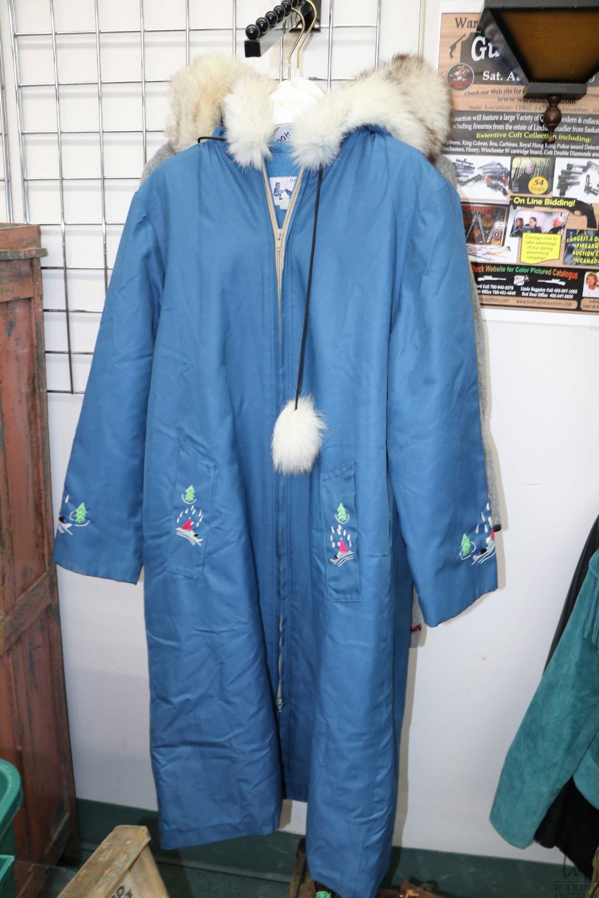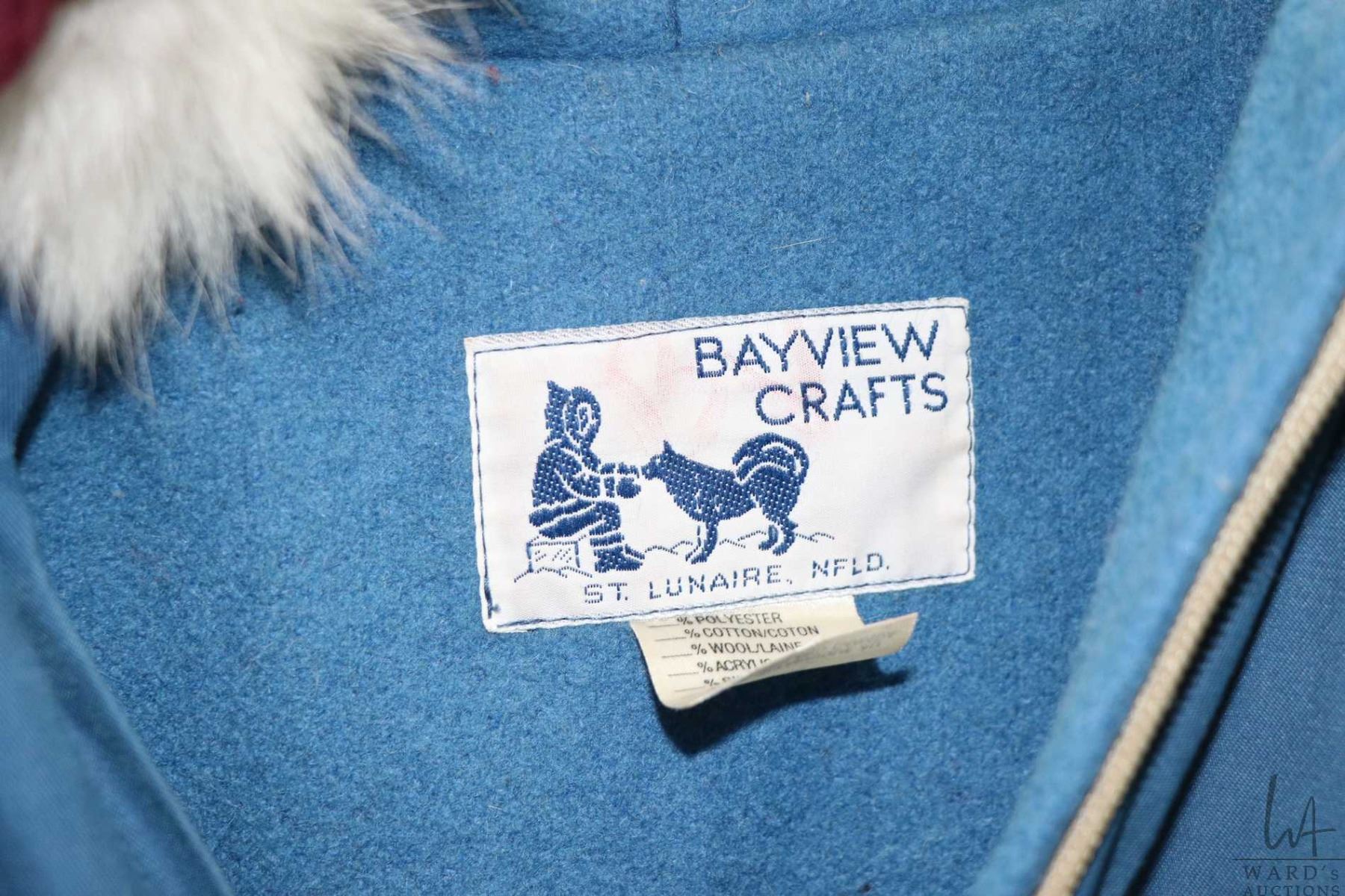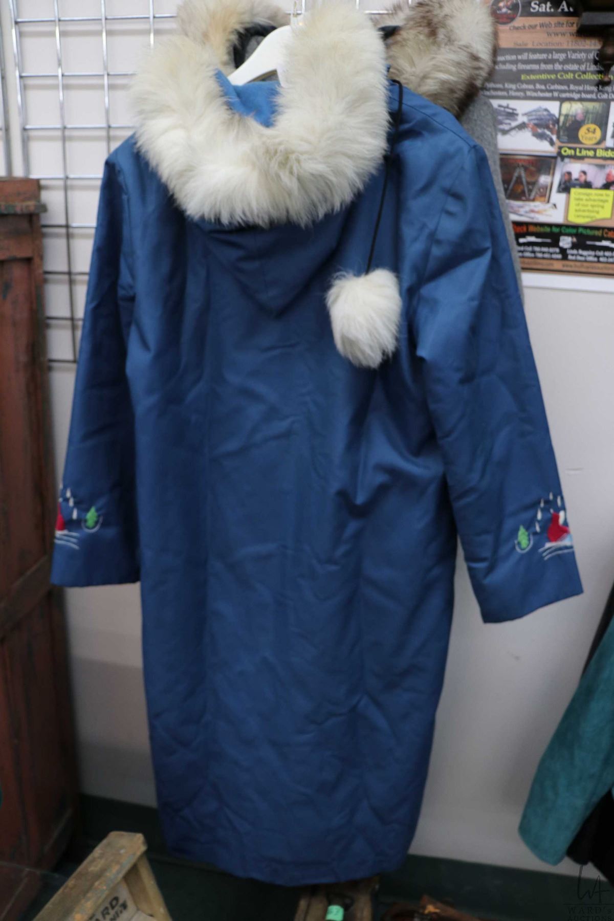 Ladies wool lined Inuit parka with blue outer shell, stitched appliques and fur trimmed hood by Bayview Craft, St. Lunaire, NFLd.