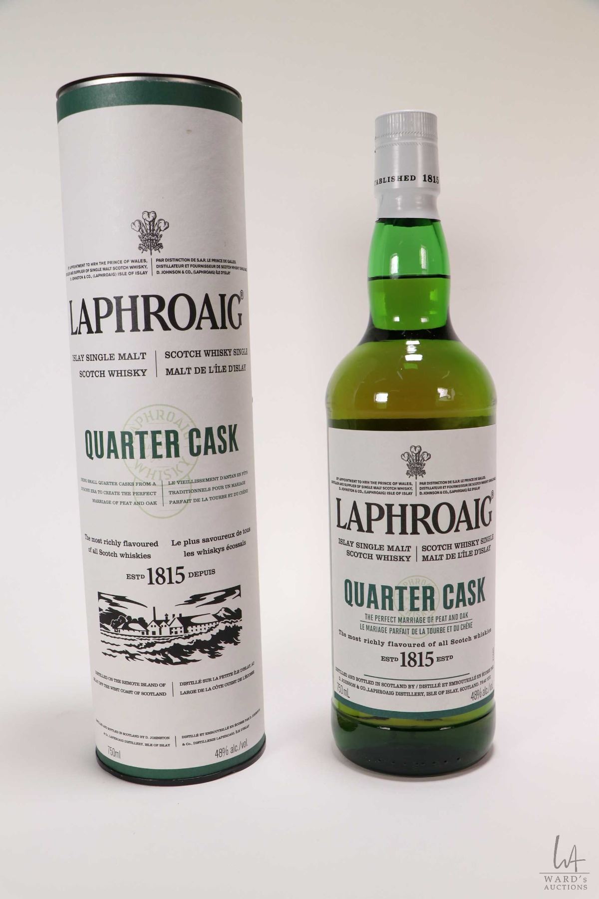 Laphroaig Quarter Cask Islay single malt Scotch whisky in 750ml bottle with cardboard sleeve. Note: No Shipping. Local Pickup Only