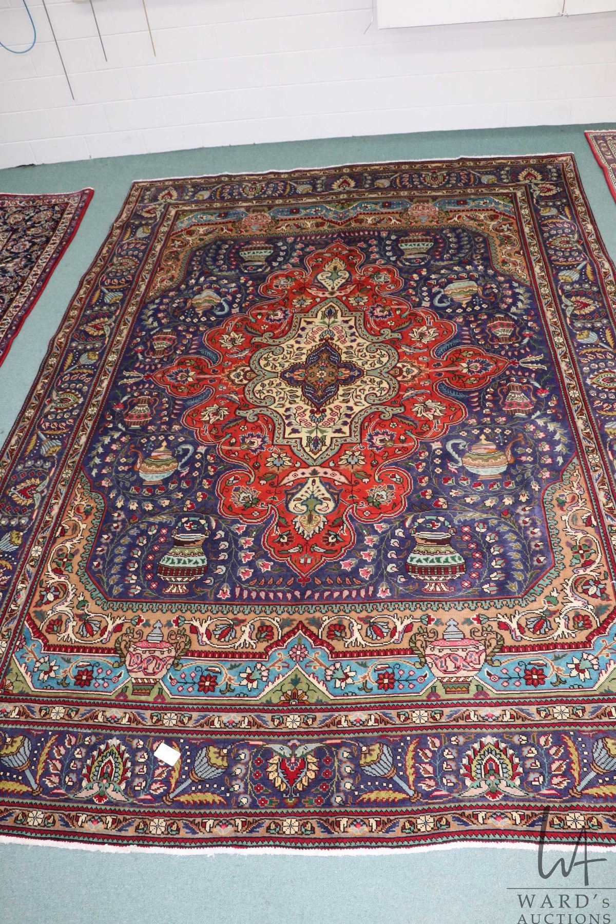 Large 100% handmade Iranian wool area carpet with center medallion, multiple borders and highlights of red, navy, purple, green etc. 113" X 158"