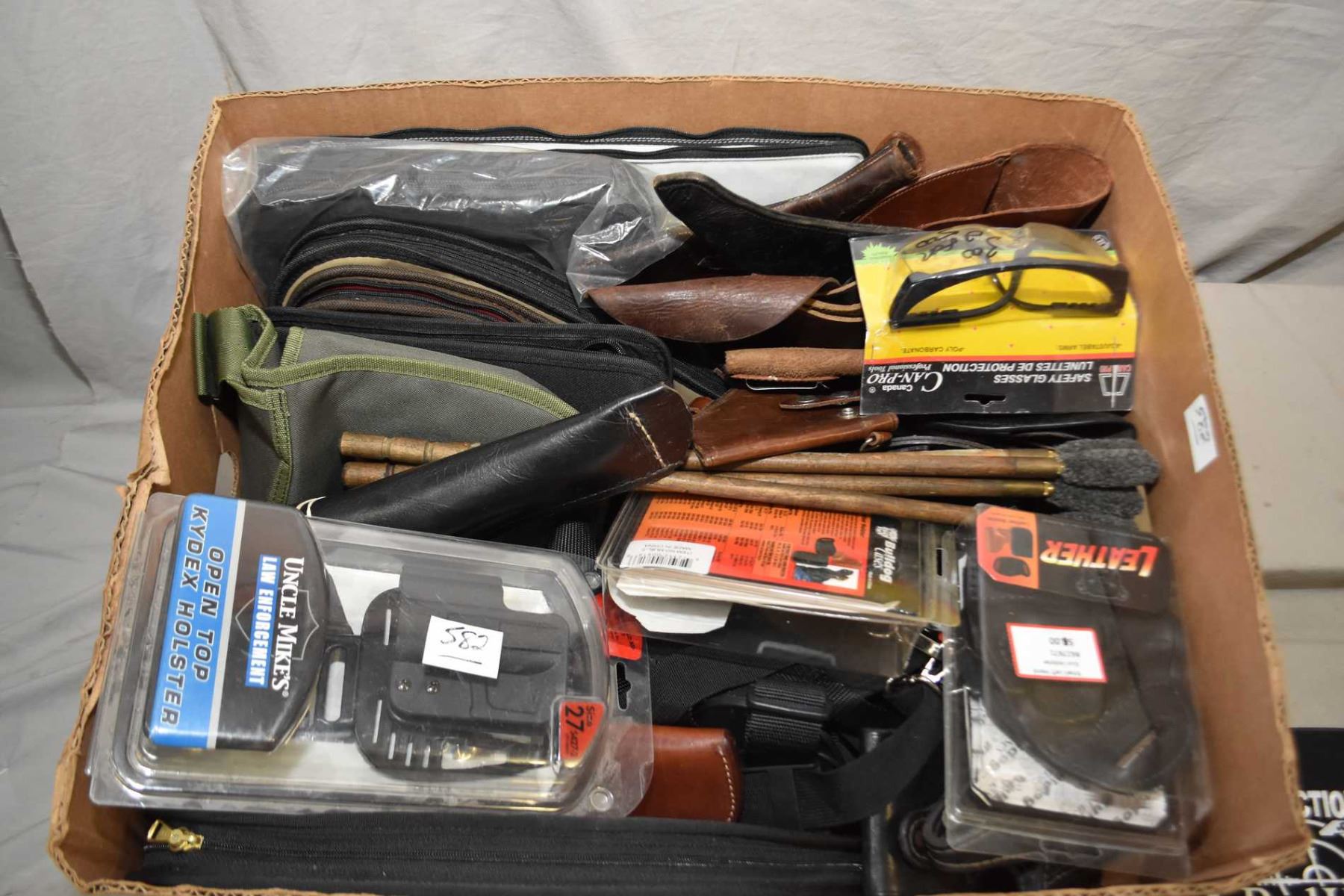 Large Box Lot : Various Holsters - Padded Pistol Cases - Wooden Cleaning Rods - Safety Glasses - etc.