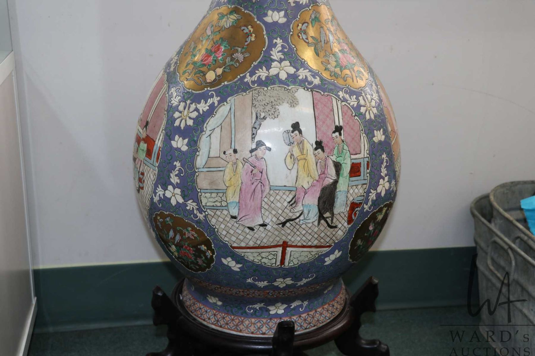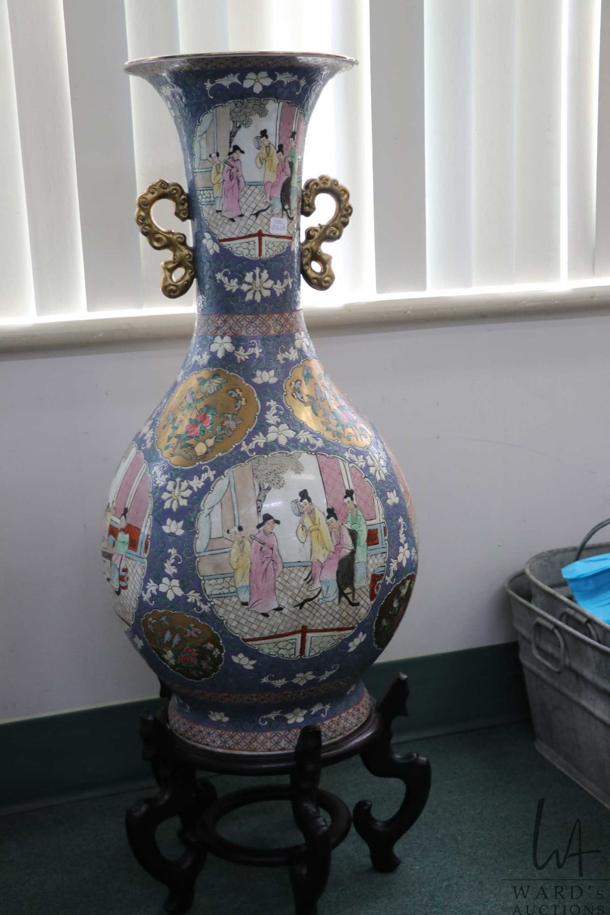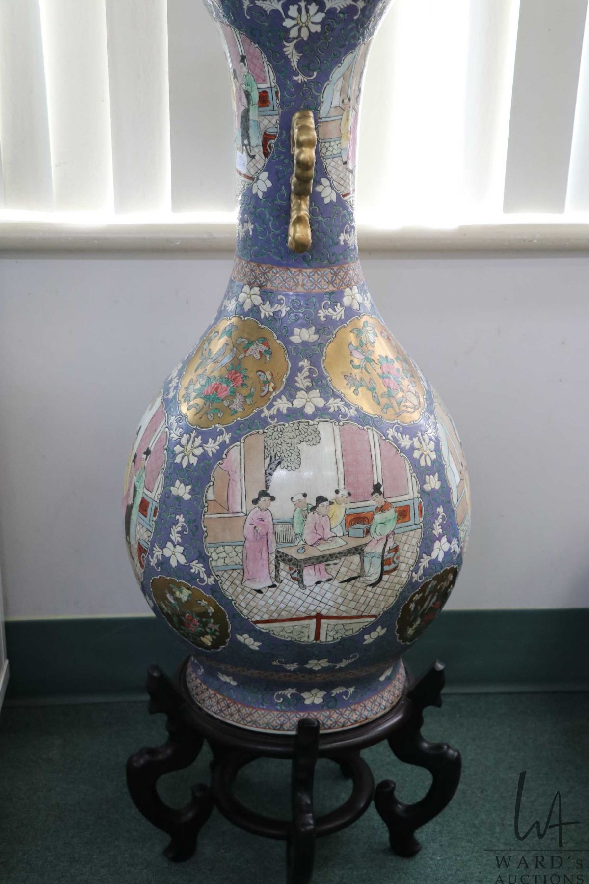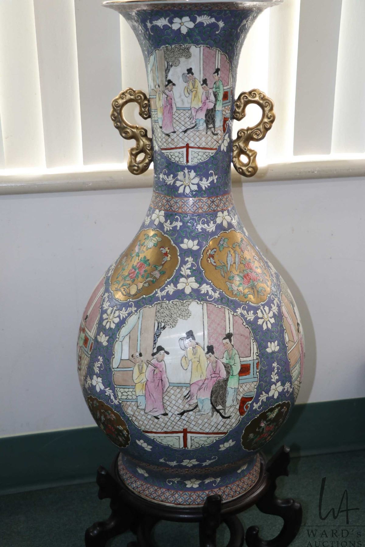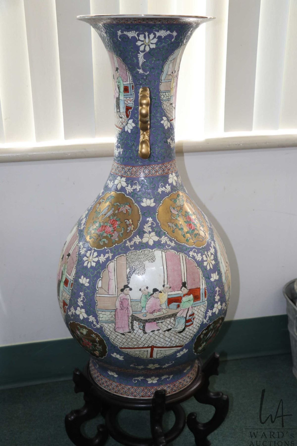 Large Chinese double handled floor vase with hand painted florals and cameos of courtyard scenes, with gold decorations, 42 1/2" including wooden stand