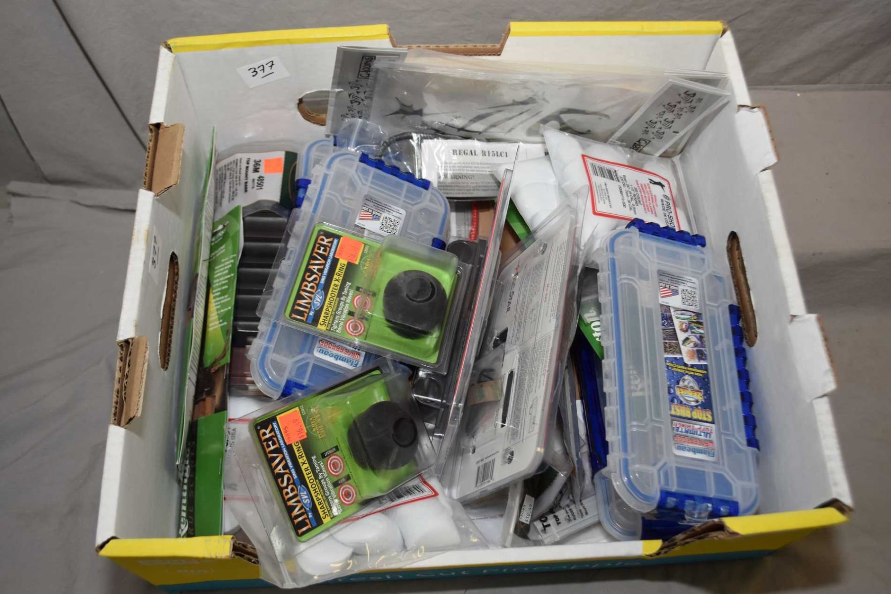 Large Tray Lot : Cable Locks - Remington True Scent Sticks - Various Patches - Asstd Decals - New Shotgun Carriers in Pkgs - Weaver Bases - Water Proofed Plastic Containers, etc.