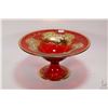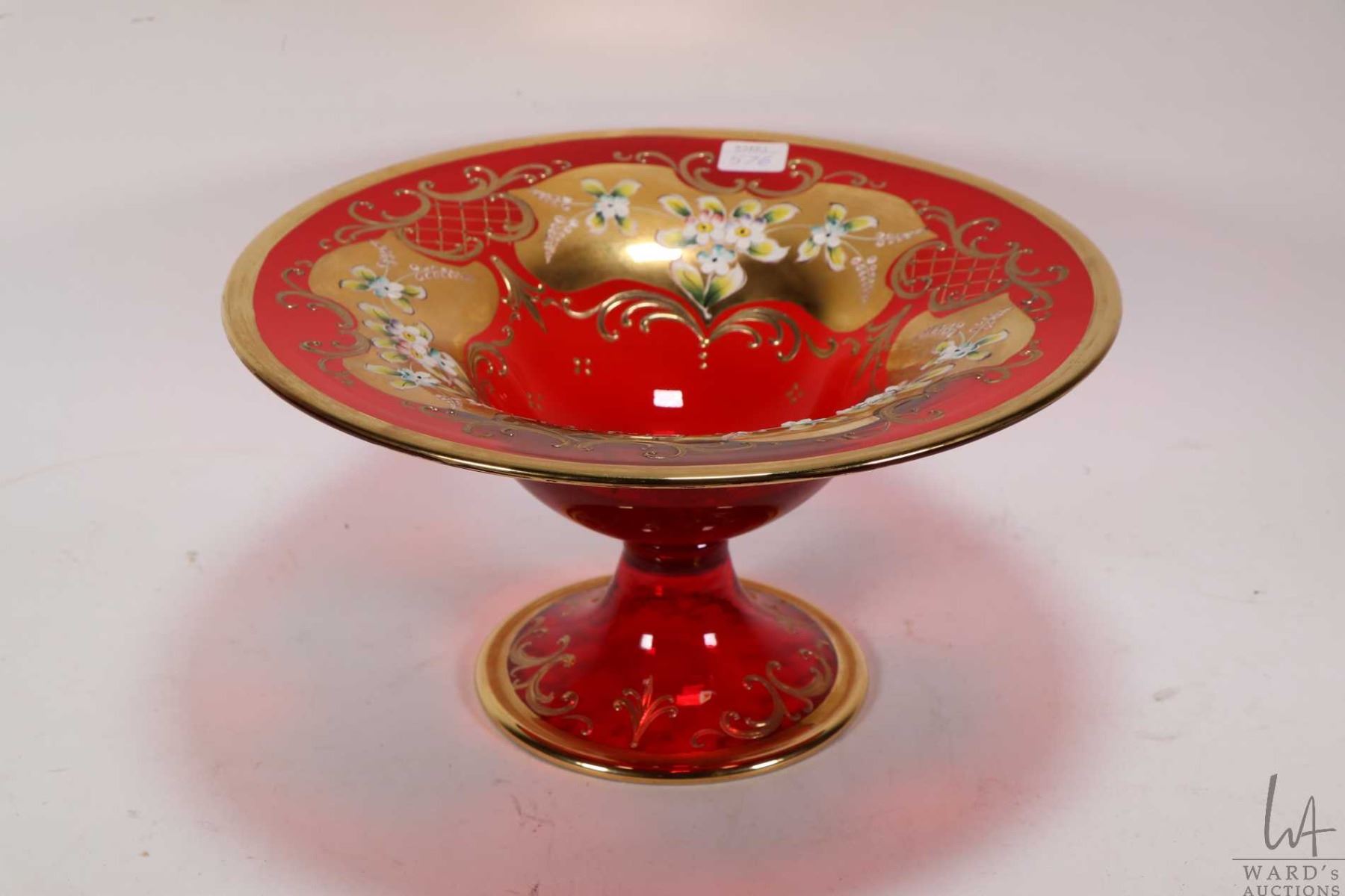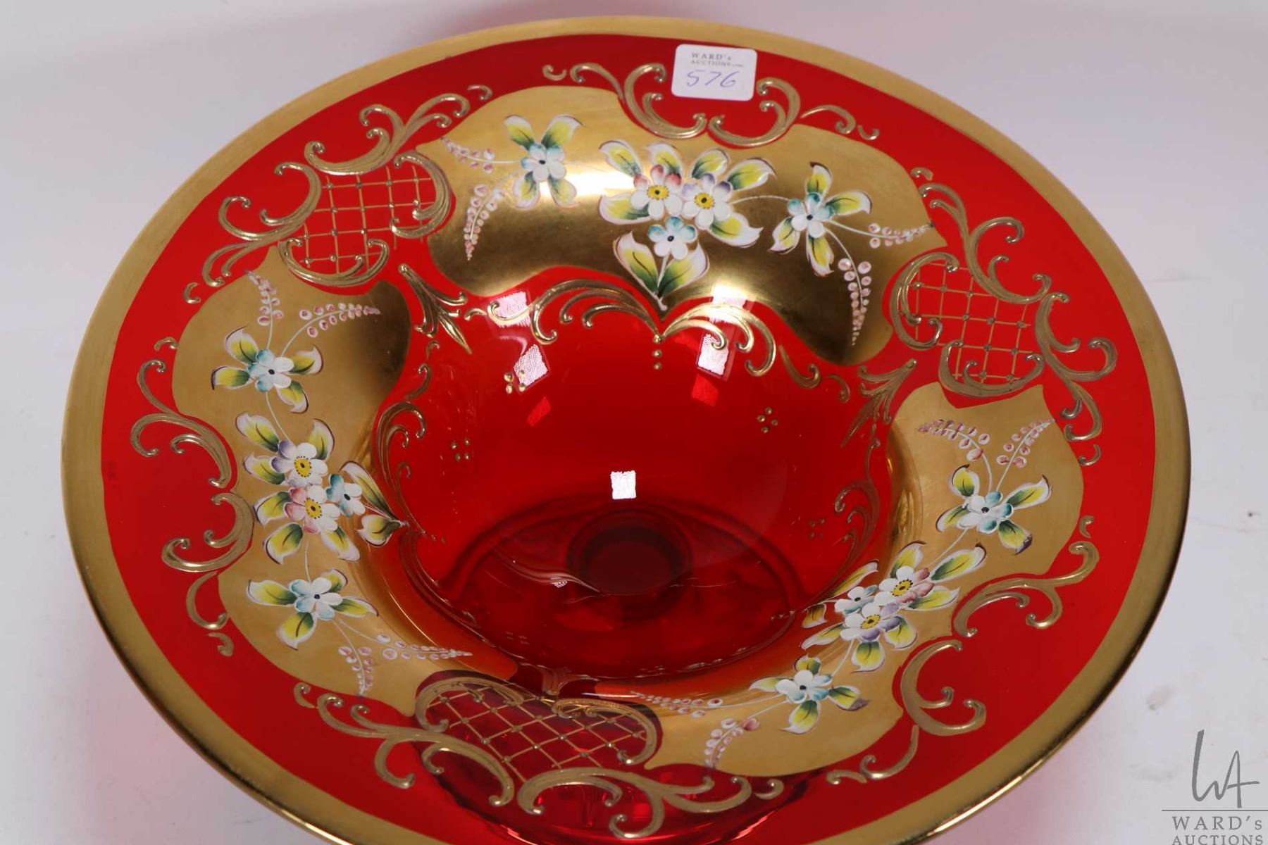 Large Venetian ruby glass pedestal bowl with hand gilding and hand painted florals, 12" in diameter. Note: Not available for shipping. Local pickup only