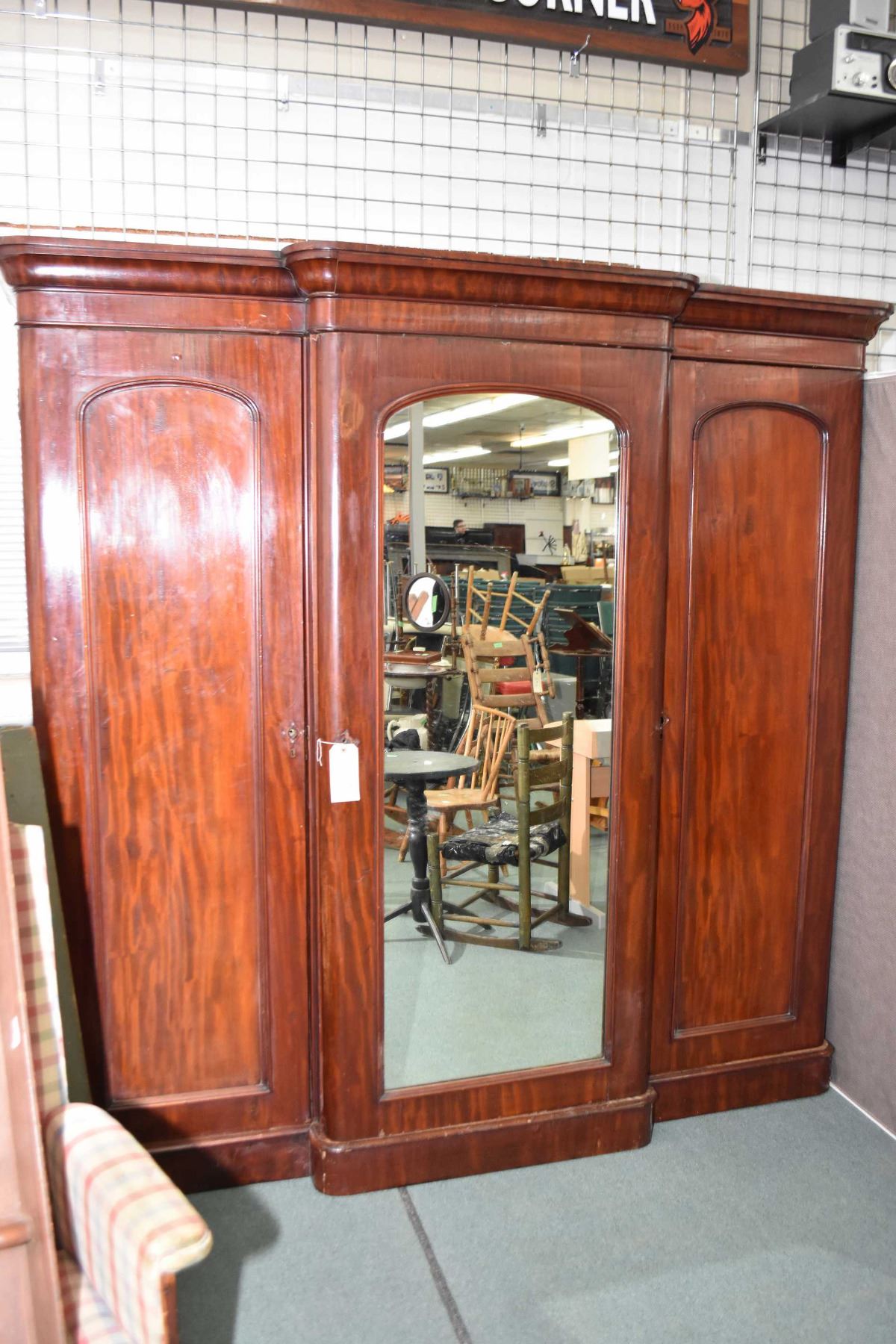 Large antique mahogany three section wardrobe fully fitted including middle section with pull out drawers and shelves, right side with pull out hanging rack, pull out shelf exposing hat storage and left side fully open with hanging rack, 81 1/2" in height