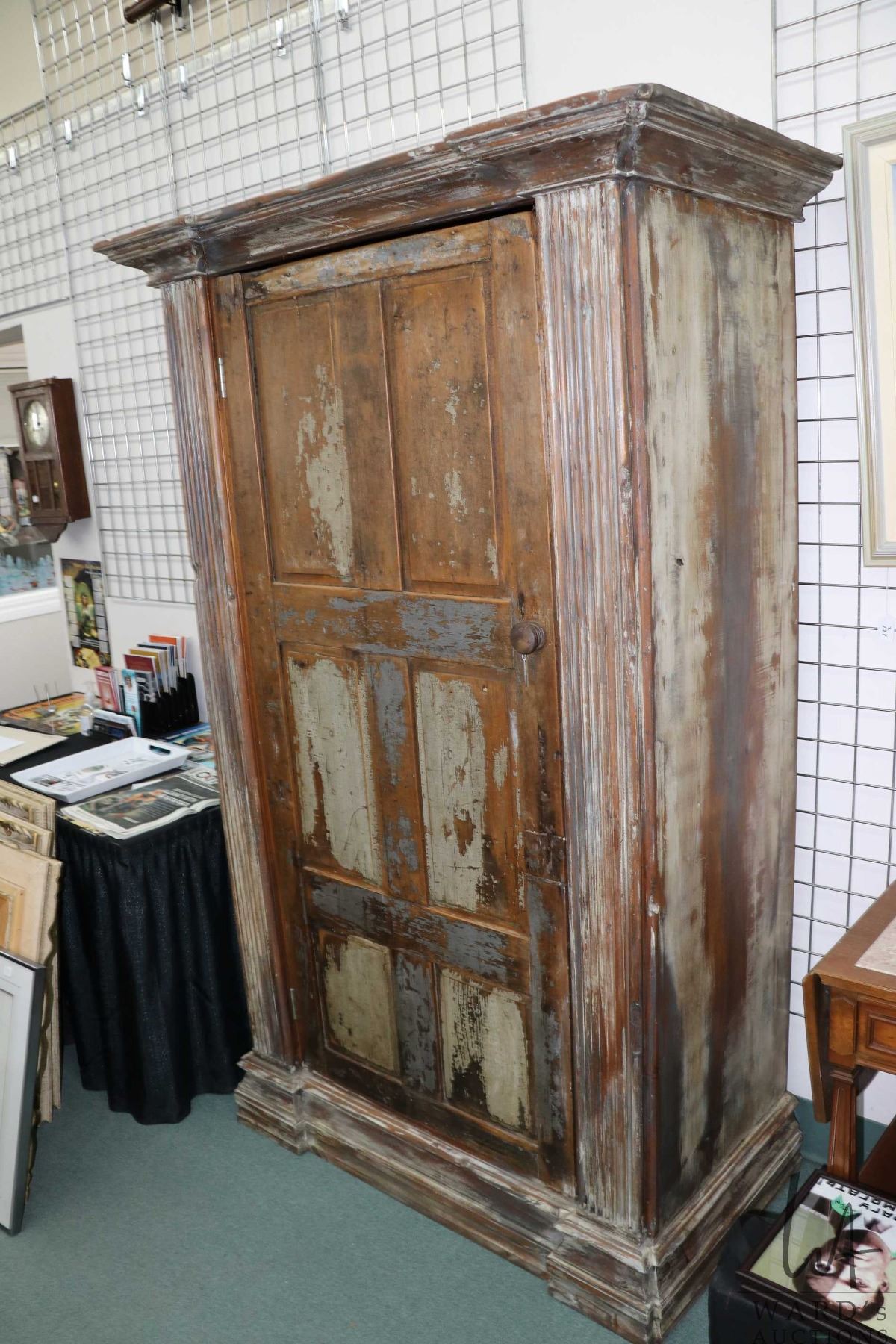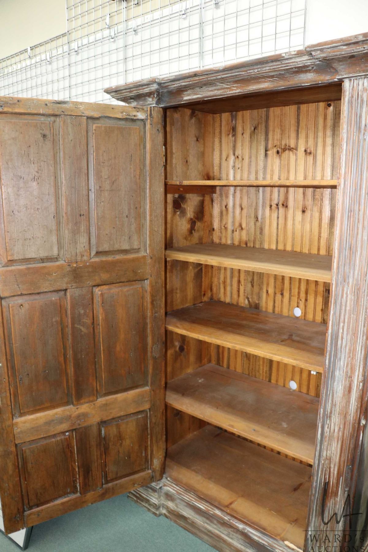 Large antique single door cabinet with multiple shelves and beautifully distressed finish, 79" H X 50" W X 25" D