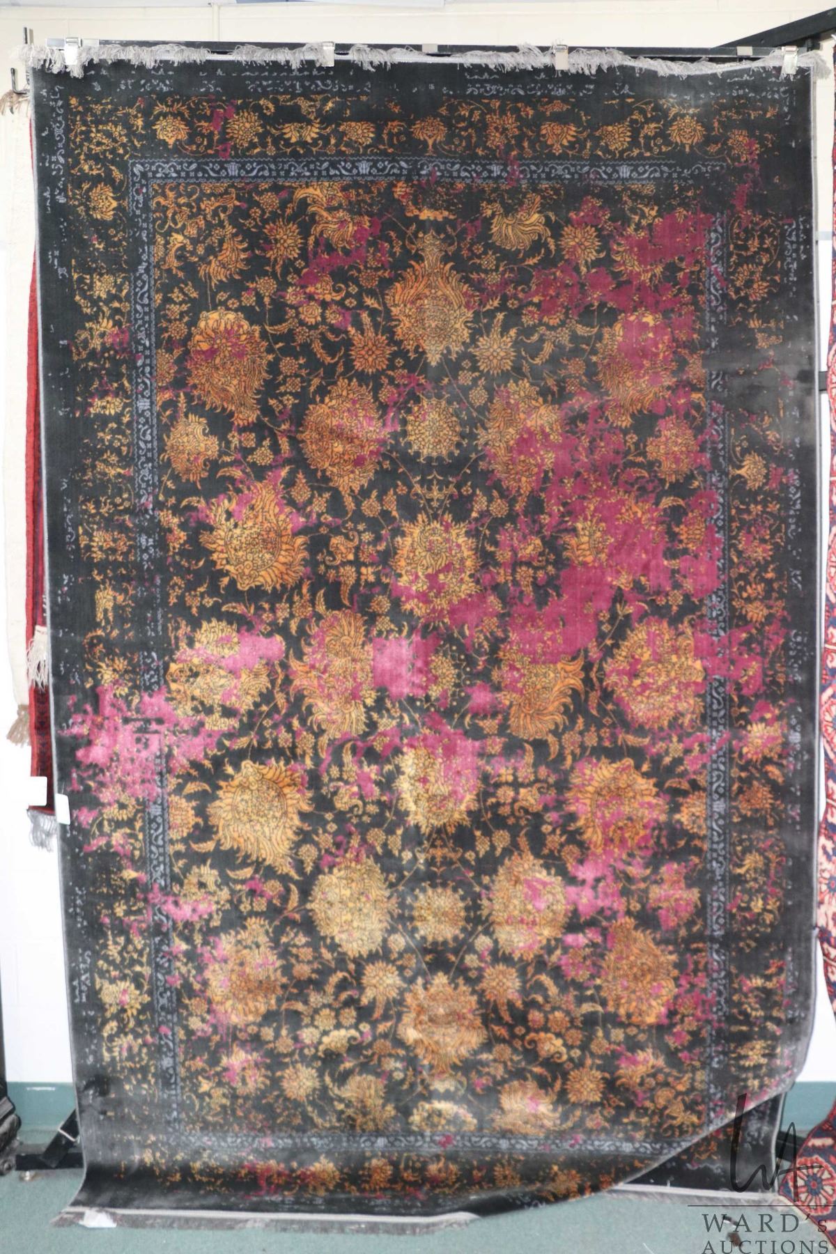 Large area carpet with purple and black background, overall floral design and highlights of gold, bl