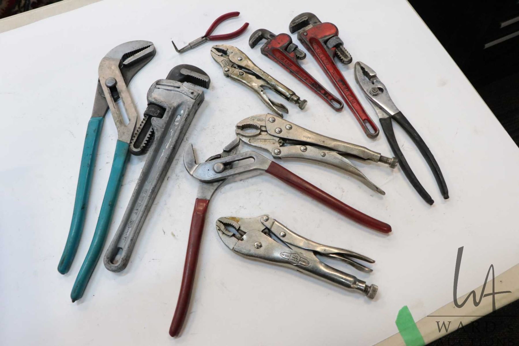 Large assortment of hand tools including vise grips, pliers, needle nose pliers, chanel lock pliers and pipe wrench