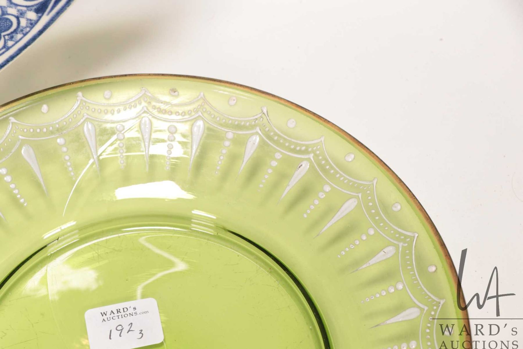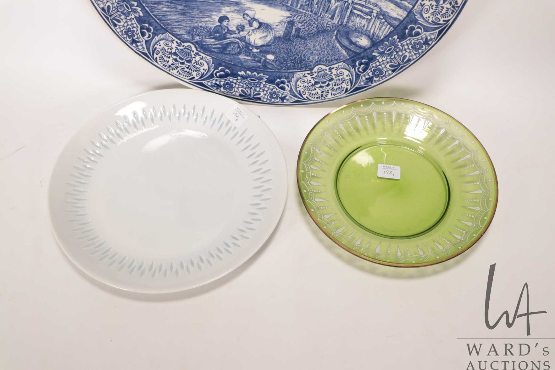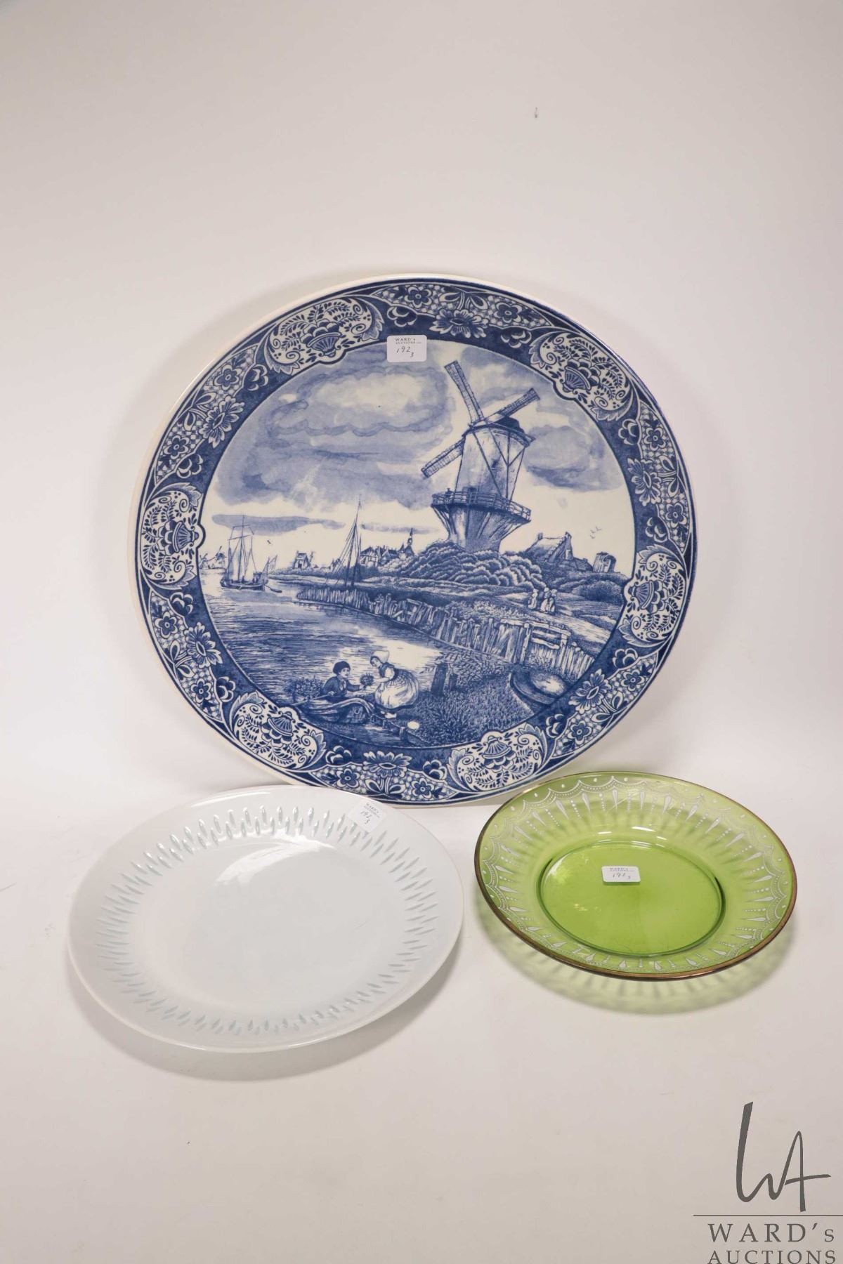 Large blue and white Delft charger 15" in diameter, unmarked plate and an antique hand enameled green glass plate