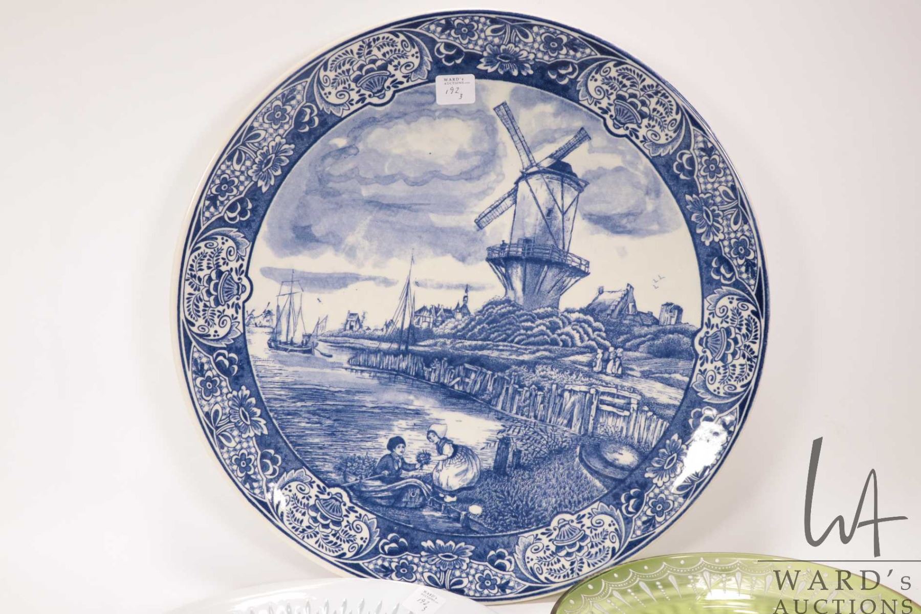 Large blue and white Delft charger 15" in diameter, unmarked plate and an antique hand enameled gree