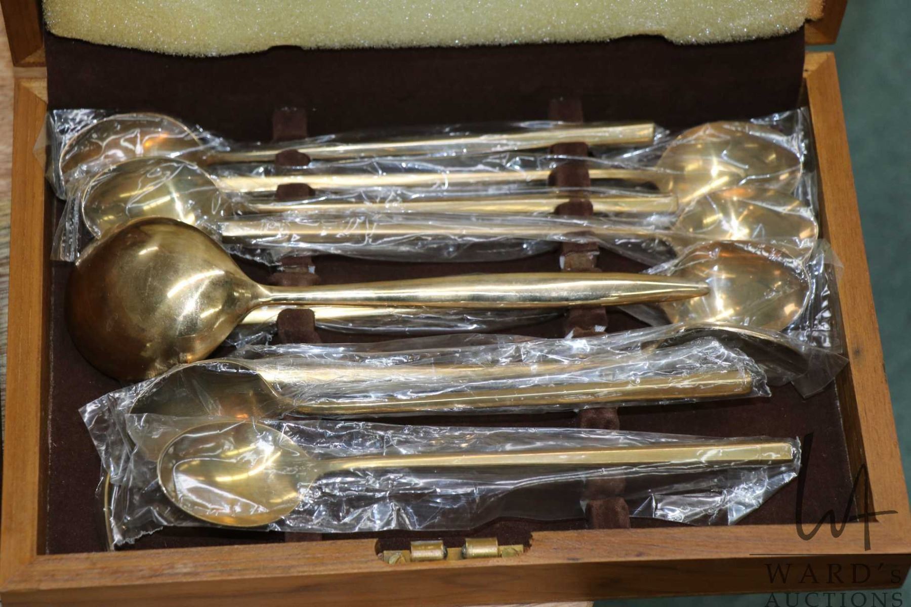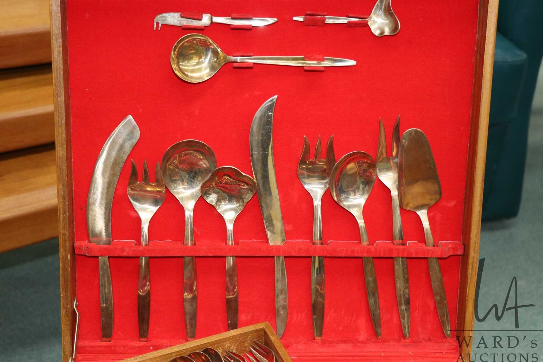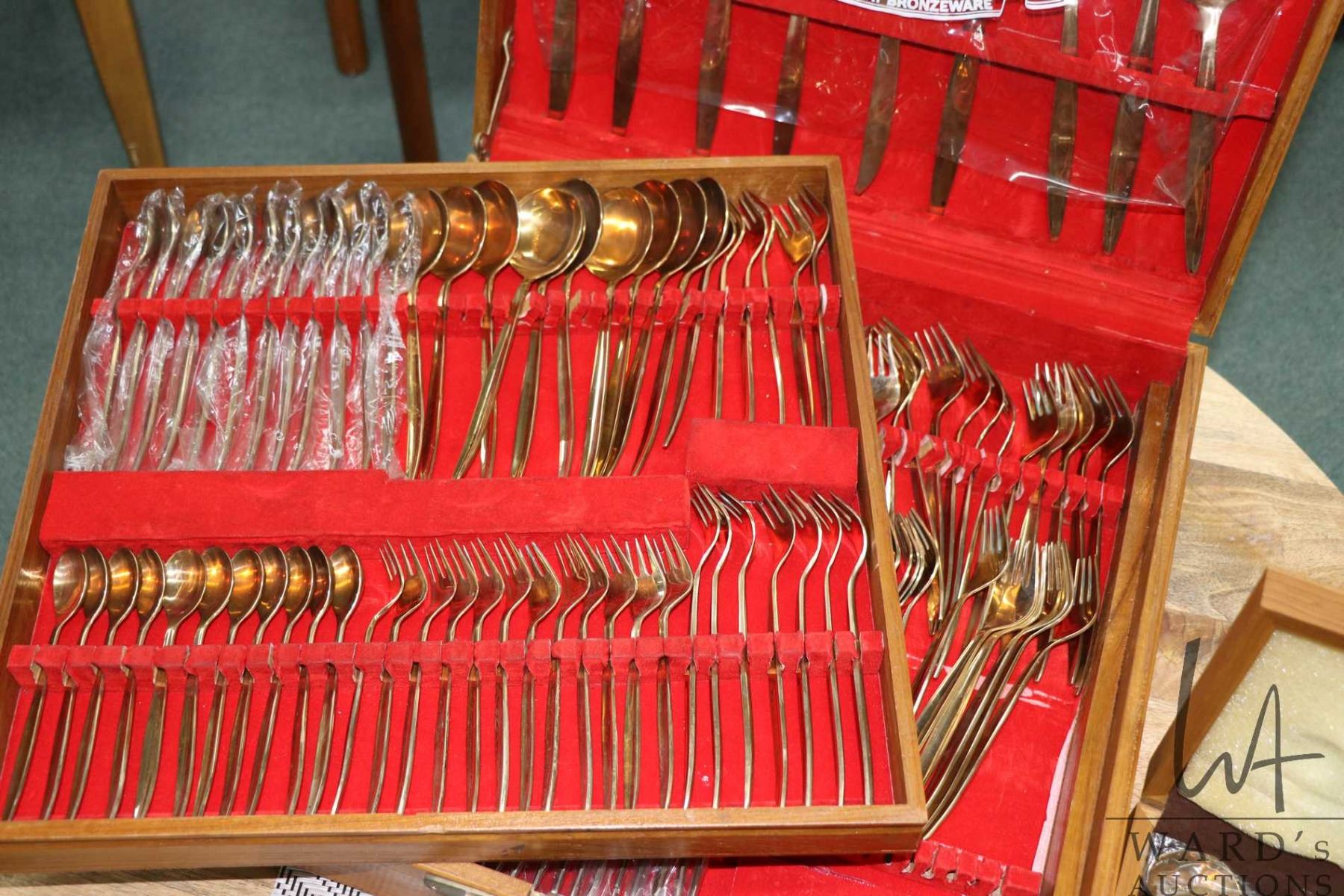 Large boxed set of solid nickel bronze flatware with place settings for twelve plus serving pieces and two accessory side packages, one with spoons and one with escargot forks. NOTE: This Lot Is Not Available For Shipping. Local pickup only.