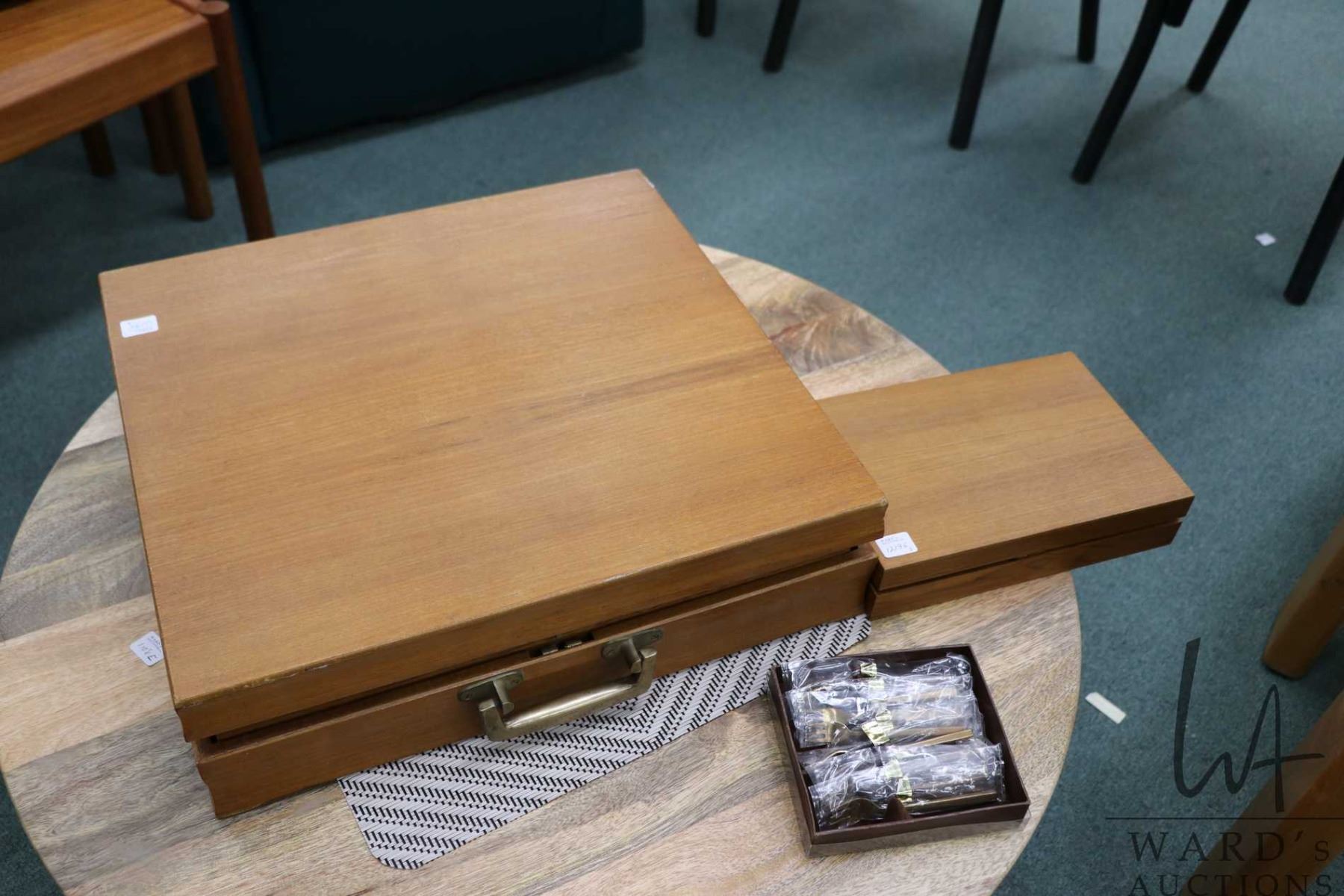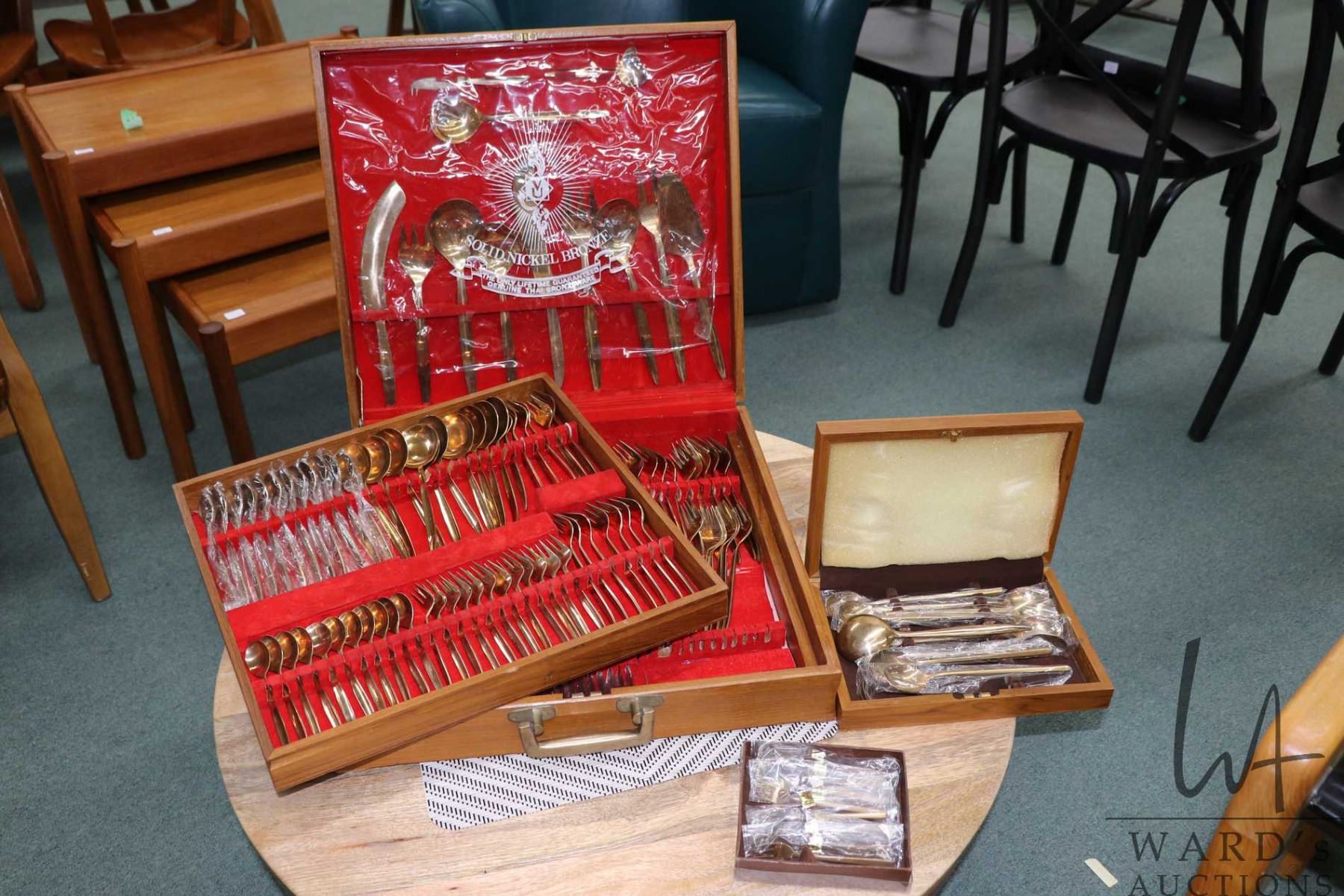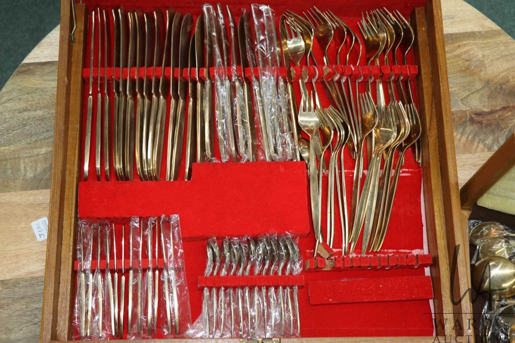 Large boxed set of solid nickel bronze flatware with place settings for twelve plus serving pieces and two accessory side packages, one with spoons and one with escargot forks. NOTE: This Lot Is Not Available For Shipping. Local pickup only.