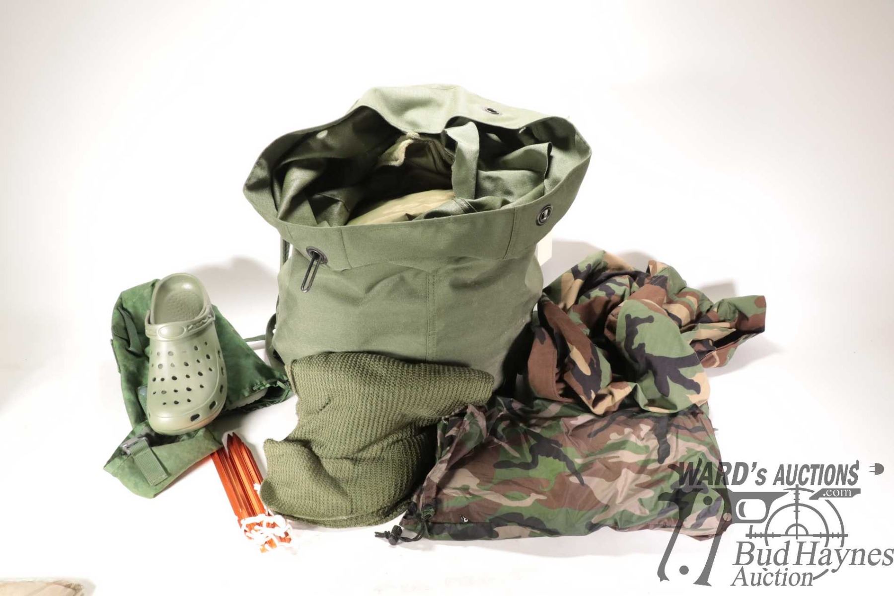 Large duffel bag and contents including weather Large duffel bag and contents including weather protective poncho, shooting vest, 4X large camo pants, Crocs (size 11), blanket, t-shirt, jacket, etc