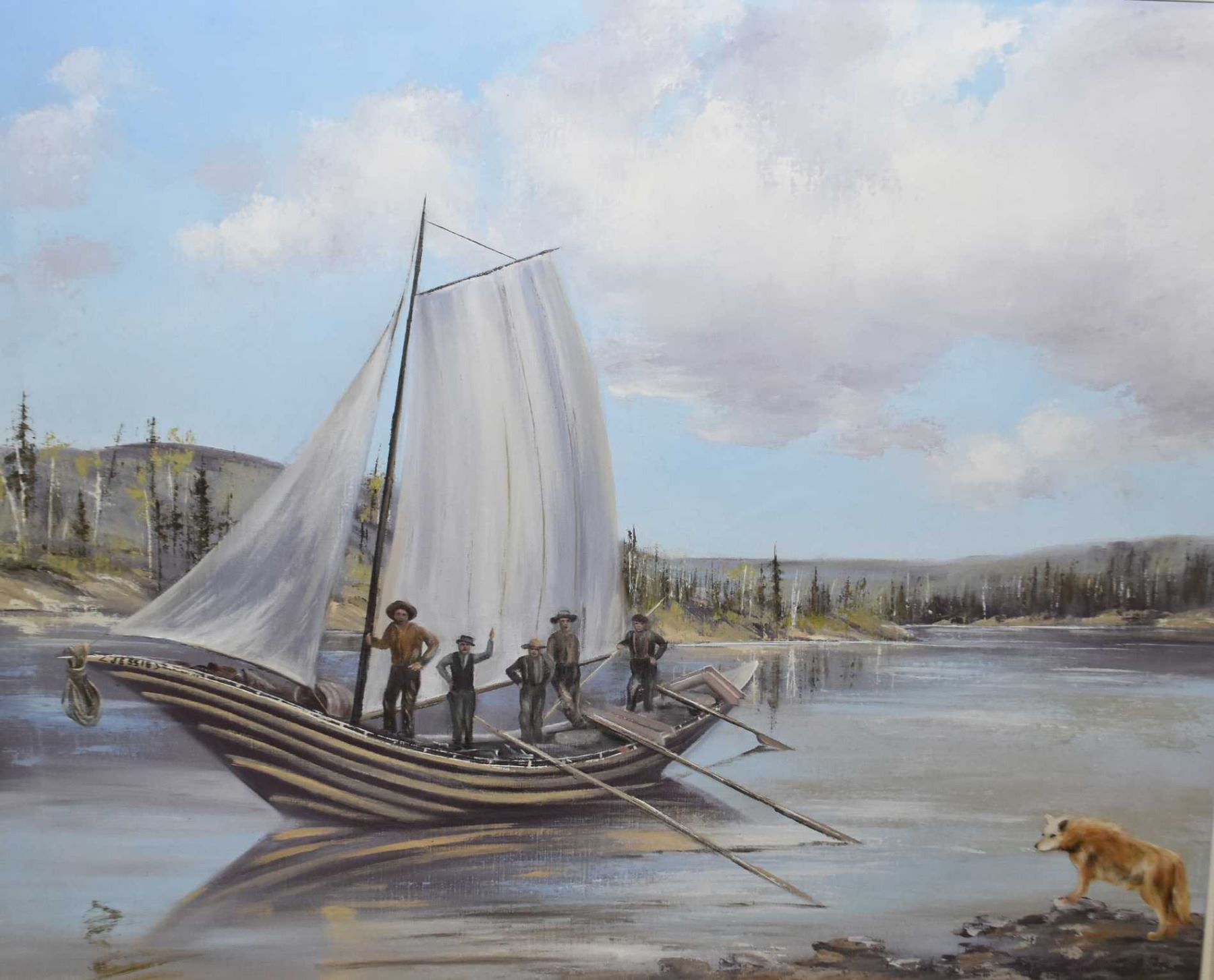 Large frame original acrylic on canvas painting of a sailboat coming to shore signed by artist Rose Leonard '71, 24" X 29"