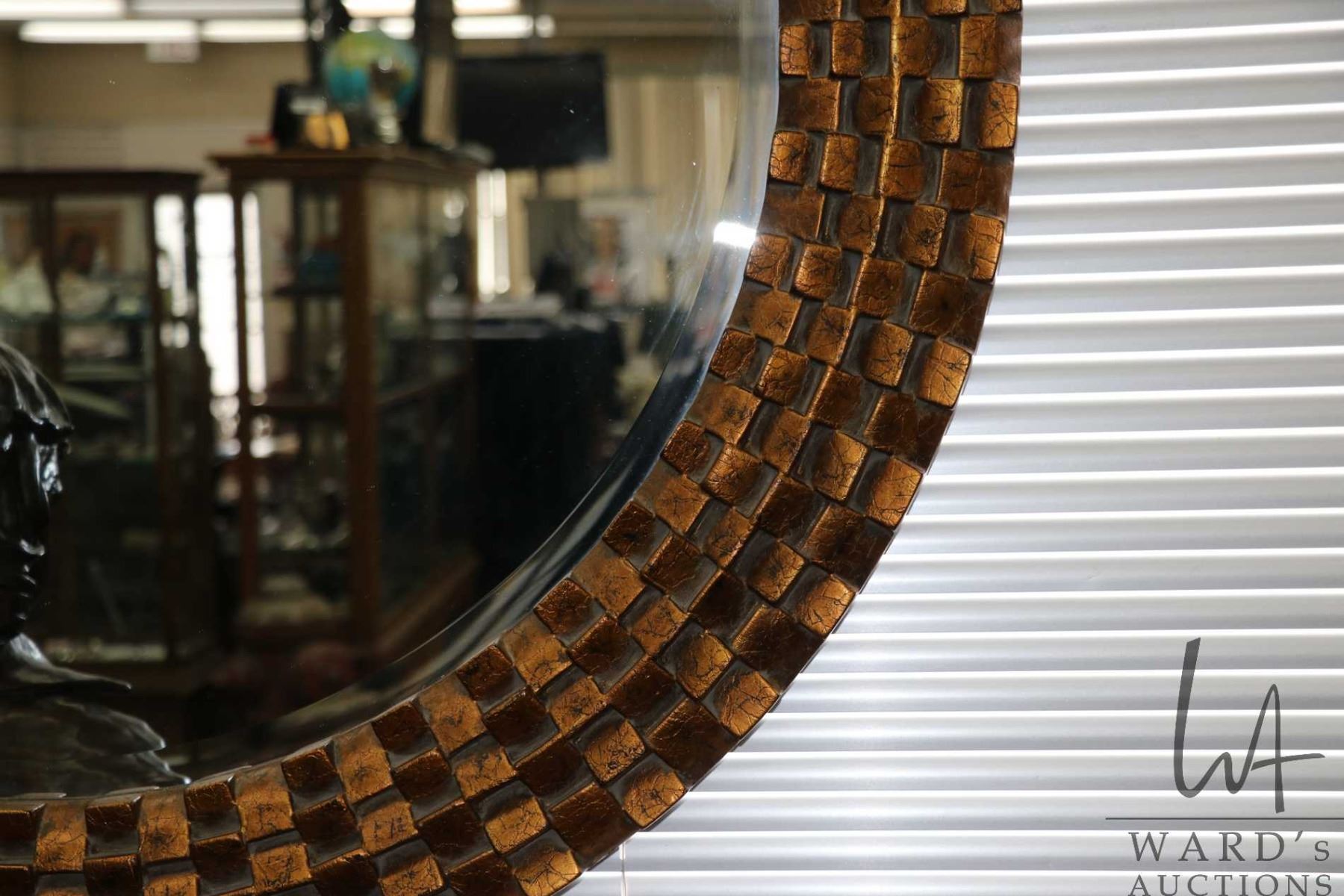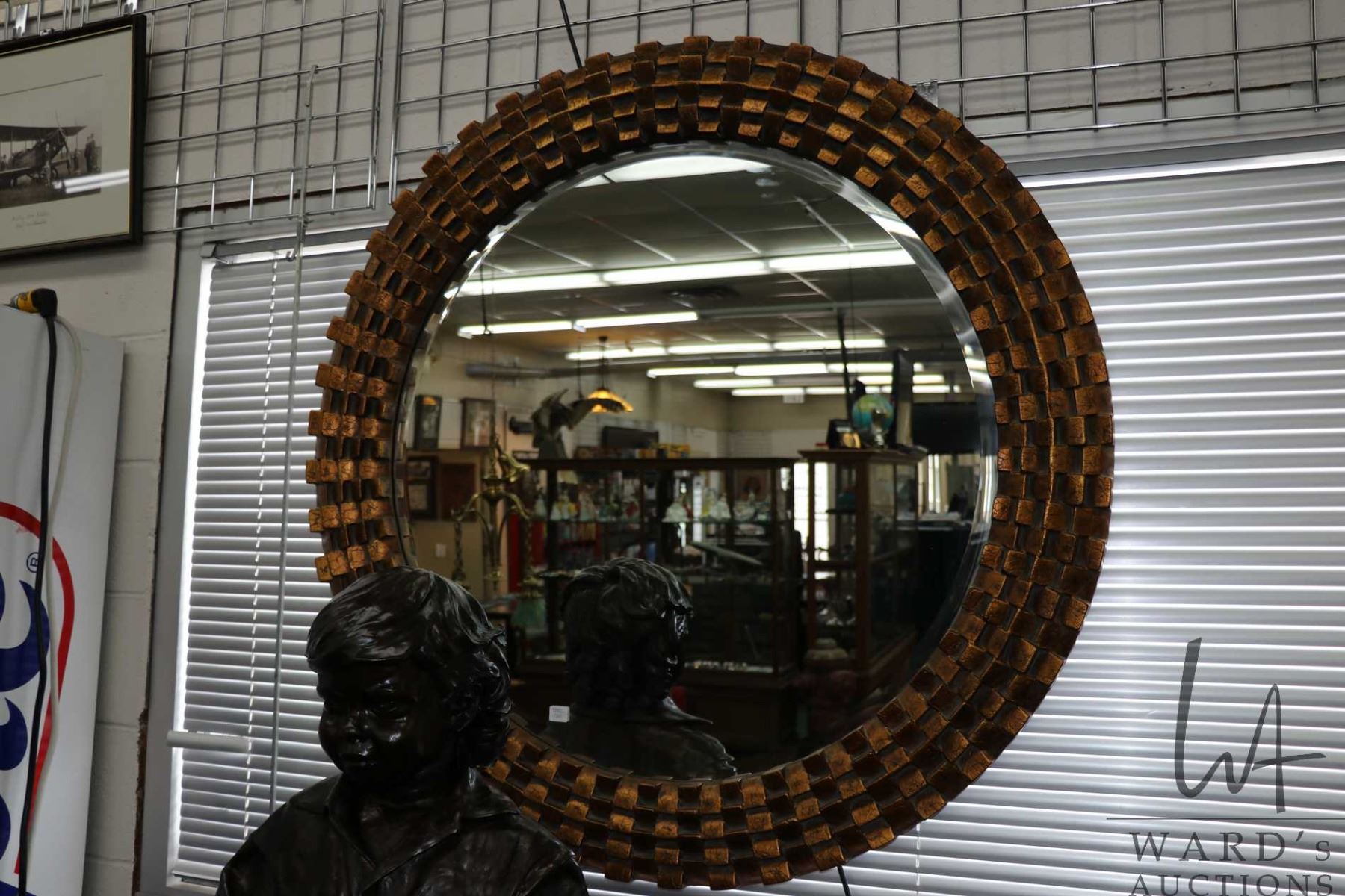 Large modern gilt framed round beveled wall mirror, outside dimensions 42"
