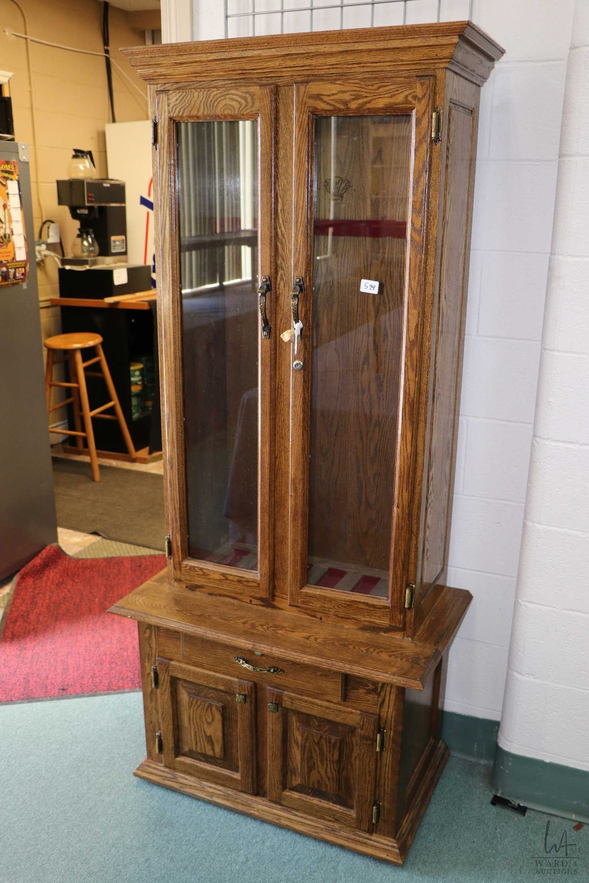 Large oak and glass locking four door gun display with lowered storage and two glazed door, set up for six long guns, includes two keys, 72" X 31 1/2" X 18" deep