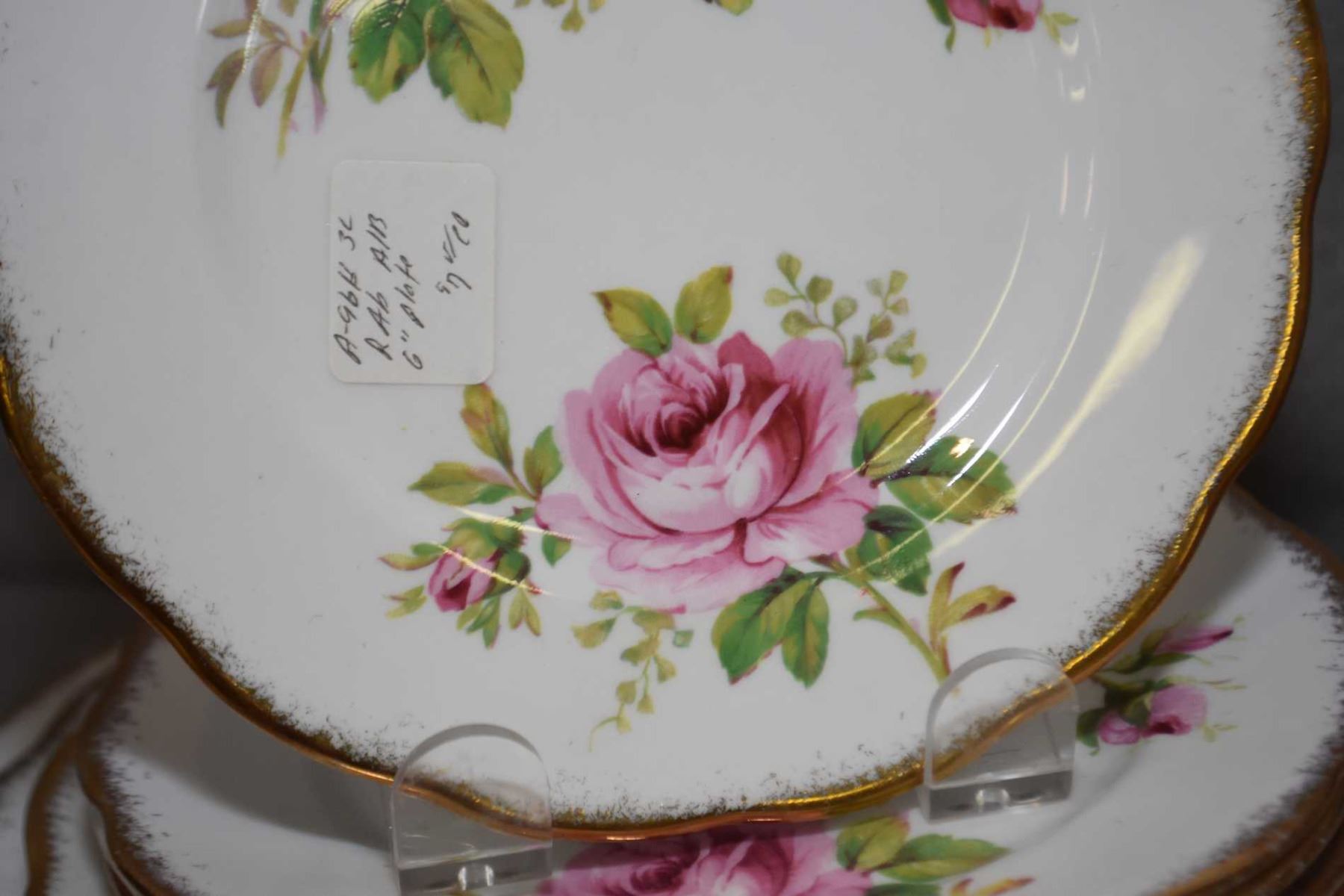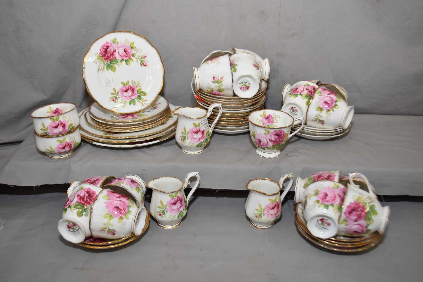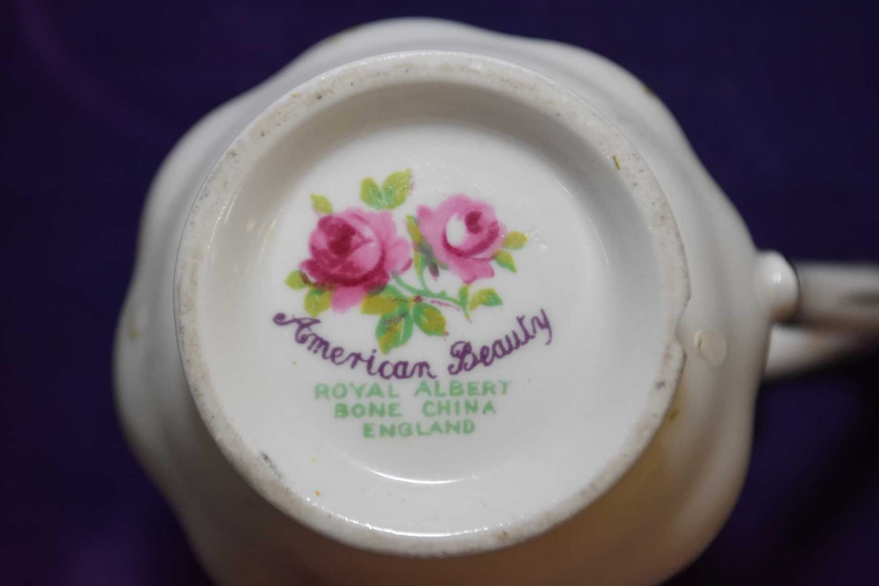 Large selection of Royal Albert American Beauty china including 23 saucers, 17 tea cups, three creamers, two open sugars, two snack plates and five side plates Note: Not available for shipping. Local bidders only
