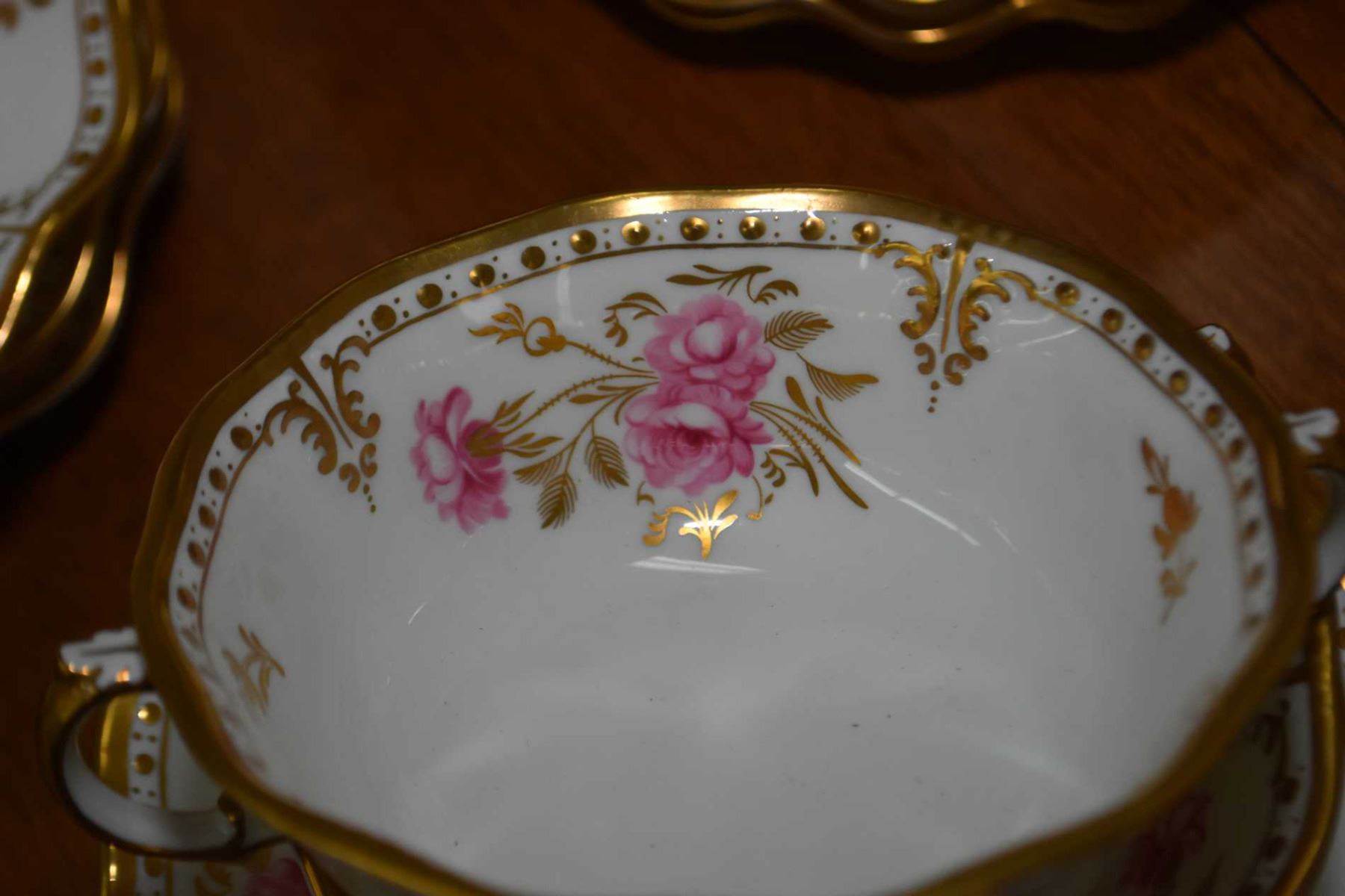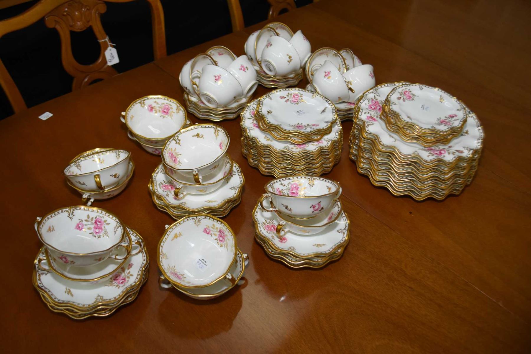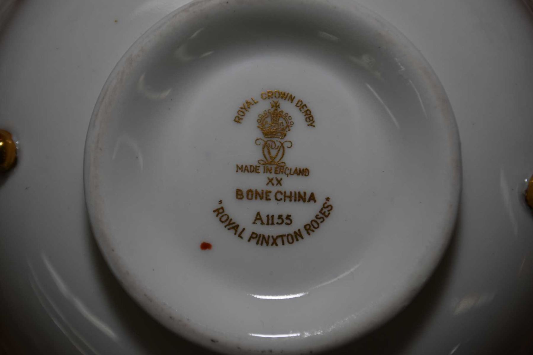 Large selection of Royal Crown Derby "Royal Pinxton Roses" A1155 bone china including twelve each of dinner plates, luncheon plates, bread plates, cream soup bowls (note one with broken handle) and under plates and cups and saucers