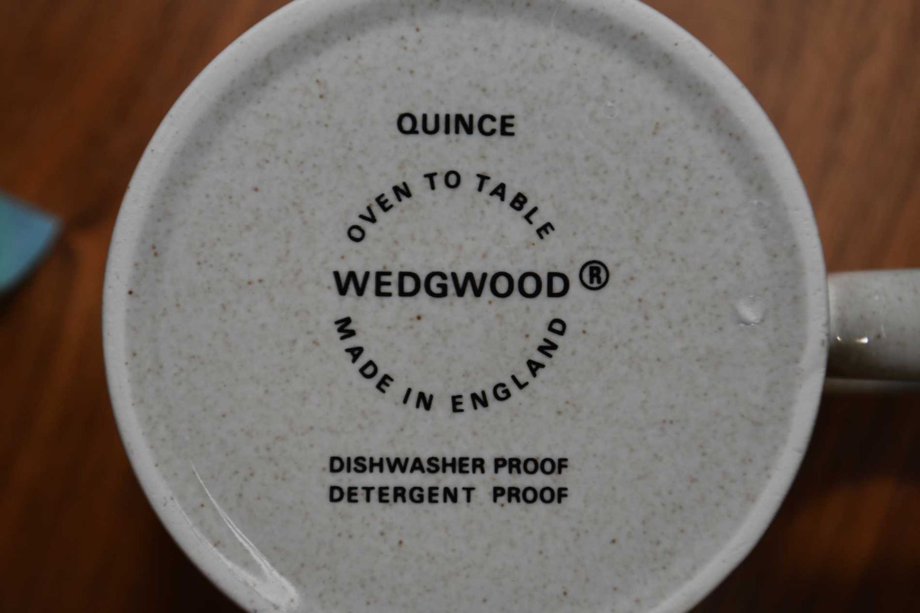 This item is not available for shipping. Local pickup only. Large selection of Wedgwood "Quince" stoneware dinnerware including setting for eight of dinner plates, side plates, bread and butter plates, cereal bowls, teacups and saucers plus coffee mugs, coffee pot, cream and lidded sugar